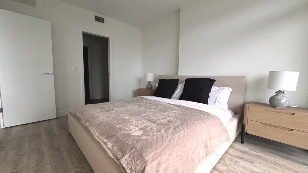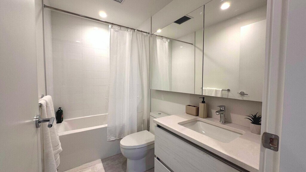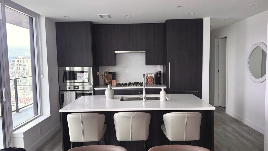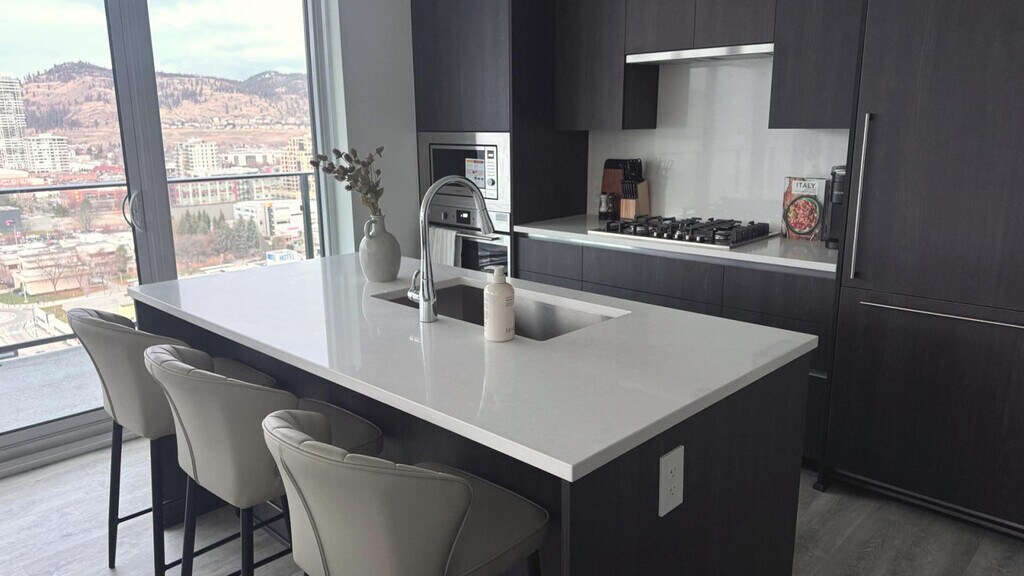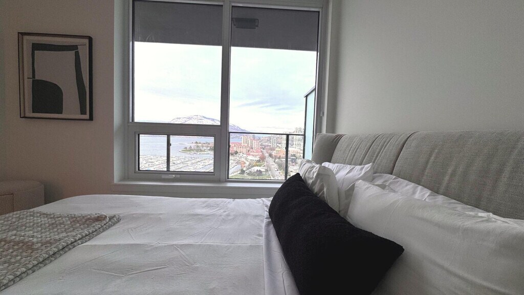 Soak up breathtaking lake, mountain, and marina views from this modern 2-bedroom, 2-bath luxury condo in downtown Kelowna. Floor-to-ceiling windows fill the space with natural light, while a sleek chef’s kitchen, elegant living area, and spacious balcony create the perfect retreat. Feel at home in this private high-rise unit. This condo features a bright living area with a sofa, TV, and large windows facing the lake. The fully equipped kitchen includes cooking essentials and a functional island set-up. For your comfort, there is central heating and air conditioning, and an in-unit washer and dryer. Enjoy full access to resort-style amenities, including a pool, hot tub, gym, steam room, lounges, games rooms, golf simulator, and co-working spaces. Located in the heart of downtown Kelowna, this waterfront high-rise offers unbeatable access to the marina, sandy beaches, walking paths, and the vibrant cultural district. You are steps from cafés, restaurants, breweries, boutique shops, Prospera Place, and the city’s most scenic parks, all framed by Okanagan Lake’s iconic beauty. Downtown Kelowna is a 3-minute walk, Kelowna Art Gallery is a 2-minute drive, City Park Beach is a 6-minute walk, Knox Mountain Park is a 6-minute drive, Kelowna General Hospital is a 9-minute drive, Orchard Park Mall is a 13-minute drive, and YLW Airport is a 25-minute drive. The condo is centrally located for walking, biking, or driving. Most attractions are within minutes. Major transit routes run along Water Street and nearby Harvey Ave (Hwy 97), providing easy access across Kelowna. Ride-share, taxis, scooters, and bike paths are readily available. No parties, events, or large gatherings are allowed. Smoking is prohibited in the property and its vicinity. No pets are allowed. The dining area includes seating for meals or remote work. [SI]