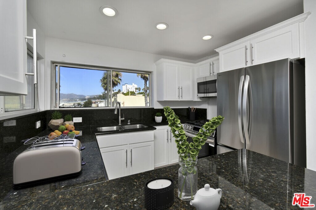 If you are looking to live near the Santa Monica Pier, you have found your new home. Brand new exterior paint, balconies and railings. This newly refreshed 1 bedroom 1 bath condo has recently been updated with new paint, blinds and flooring. It is a light and bright 680 sq. ft. condo with 2 balconies and expansive ocean views from the bedroom and kitchen and a cozy living room. Crown molding has been installed throughout the unit. The kitchen has been outfitted with high end stainless steel refrigerator, microwave, stove top/oven range and dishwasher by all by GE Cafe along with an island that has a built in wine rack. The unit does a have custom built in desk with great storage above and large file space below. The condo also has a walk-in closet, 2 tandem sinks in the bathroom and ceiling fans in the living room and bedroom. There is 1 parking space in a subterranean parking garage. The elevator has just been updated and new landscaping was recently upgraded. Washer and drying facilities are on-site. Renters love this unit and after they move in, they generally extend their lease. If you want to be at the heart of world class restaurants; shopping and beaches with great access to easy access to transportation then this is the one for you. I always set a fair price and this one will not last long