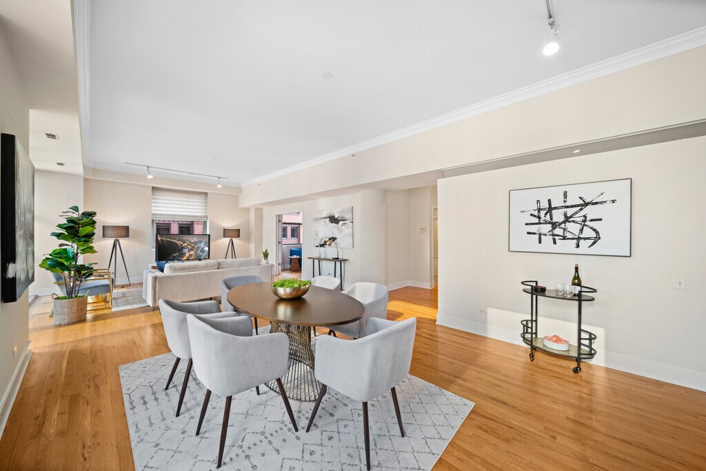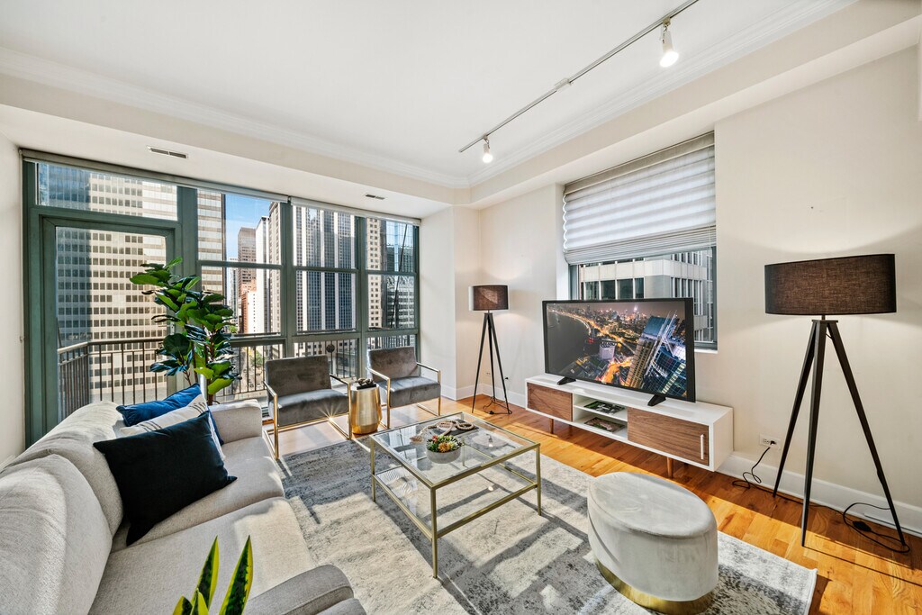 Discover unrivaled luxury in this exquisite North-facing loft, meticulously redesigned by a renowned developer in the heart of Chicago's prestigious River North. Elegance abounds in this remodeled residence, showcasing soaring ceilings, rich hardwood floors, and a captivating fireplace at its heart. Revel in city vistas from your private balcony, perfect for relaxation or hosting. The master bathroom boasts a double sink vanity and heated floors, while the second bath matches the same lavish standard. The kitchen flaunts high-end appliances, elegant quartz countertops, and new designer light fixtures. A heated garage spot and storage unit are included. With no pet or rental restrictions, this is your chance to embrace your dream lifestyle in one of Chicago's most coveted neighborhoods. Don't miss this exceptional opportunity to own a truly magnificent residence.