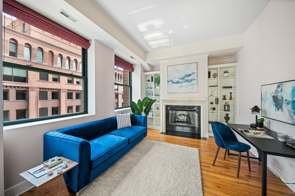 Spacious one-bedroom loft with an additional 9x13 bonus room! Updated kitchen with granite counters, stainless appliances, and garbage disposal. Large living/dining area with fireplace, floor-to-ceiling windows & balcony. Hardwood floors throughout. Office nook just off the living room, perfect for home office. Good size bedroom with a wall of closets. Dual-vanity natural stone bathroom with ample cabinet space. Full-size washer & dryer & long hallway of additional storage closets. Amenities include on-site management, a concierge, a fitness center, a bike room & more. Steps from the French Market/Ogilvie Transportation Center, blocks from Union Station, Riverwalk, restaurants, and entertainment.