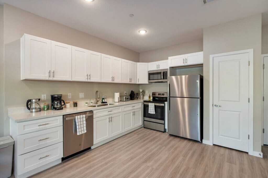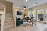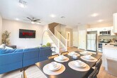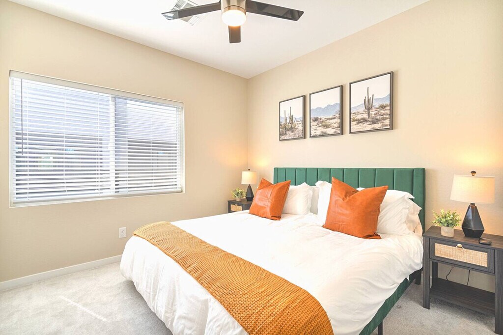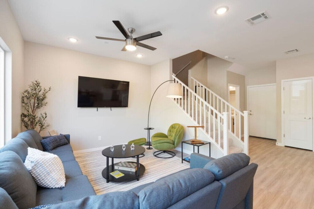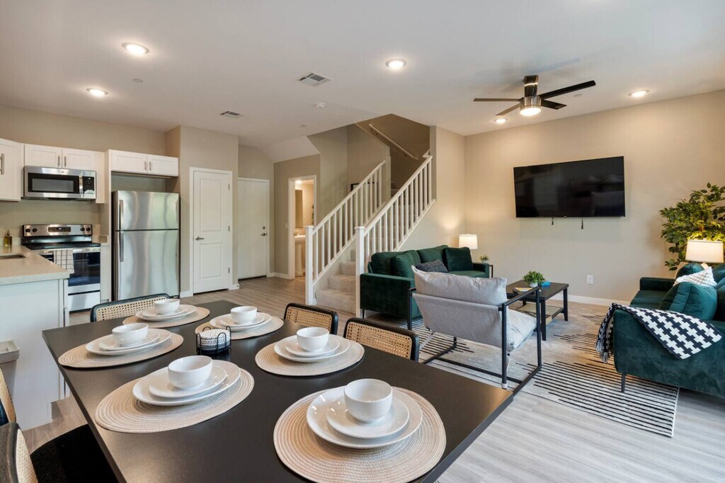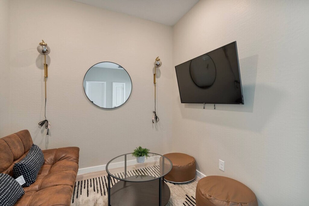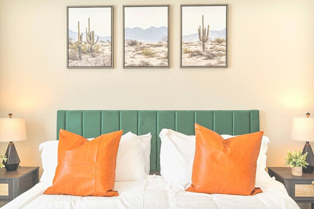 Feel at home in these new, side-by-side townhomes, perfect for hosting your whole team, family, or friends. These suites are within walking distance of Surprise Stadium. Perfect for large gatherings, these modern suites total 6 bedrooms with 8 beds, 1 futon, 2 patios, 2 fully equipped kitchens, and 2 living rooms. Each suite includes a spacious living room with 2 sofas, a lounging chair, a 65" smart TV, a coffee table, and a dining room with a big table and 6 modern chairs. The fully equipped kitchens feature new stainless steel appliances, utensils, pots and pans, coffee mugs, a coffee maker and coffee filters, a kettle and tea bags, and wine glasses and an opener. Each of the bathrooms includes a modern half-bathroom on the main level, a full bathroom upstairs with a glass shower door, and an en-suite full bathroom with a bathtub. All 3 bedrooms include plush pillows with new sheets, decorative pillows and a throw, a ceiling fan, and lamps. Enjoy amenities like putting areas, games, in-house laundry with detergent included, and a heated pool. There is an $10 fee per guest after 10 guests. Arizona Broadway Theatre and AZ Challenger Space Center are cultural highlights, and some of the area's activities can be experienced at Wigwam Golf Resort and Sun Village Golf Course. State Farm Stadium or Peoria Sports Complex are nearby. Surprise Stadium is a 14-minute walk, Banner Del E Webb Medical Center is a 5-minute drive, Granite Falls Golf Course is a 6-minute drive, Wildlife World Zoo and Aquarium is a 12-minute drive, and Luke Air Force Base is a 14-minute drive. In-N-Out Burger is a 19-minute walk, McDonald's is a 3-minute drive, Raising Cane's Chicken Fingers is an 18-minute walk, Dutch Bros Coffee is a 3-minute drive, and Sonic Drive-In is a 3-minute drive. Phoenix Deer Valley Airport (DVT) is a 34 min drive. Check-in and check-out times are mandatory unless scheduled and confirmed at a minimum of 24 hours in advance. A $50.00/hour penalty will be applied if you fail to check-out by 10 am or by the agreed upon check-out time. Evidence of pets inside the property will result in a $100.00 fine charged to guests. For special events of over 16 people there is an additional $150 special event fee. There is a strict no-smoking policy in all units, and you will be fined $500 if you violate it. A surcharge of $100.00 per undeclared guest per night will be applied for unapproved guests. Suite 1 includes a comfortable office chair and a desk with a lamp. Suite 2 includes a den with a futon couch (also serves as a twin-size bed), a coffee table, a 55” smart TV, and a room divider. The outdoor space includes a private patio with Astroturf grass, a seating area and small table, and a mini-putt green with 3 clubs. Easy access garage and some fun games in the unit. [SI]
