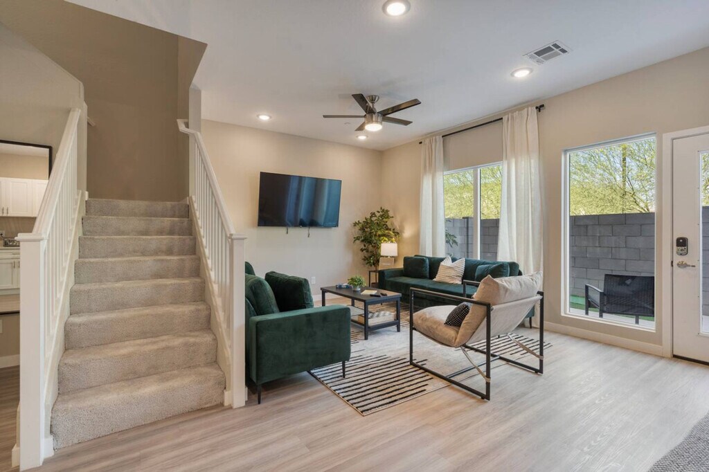 Feel at home in this spacious suite, just minutes from Surprise Stadium. This townhome has room for everyone to relax. This property features a fully equipped kitchen, plush bedding, a 65" Smart TV, comfortable couches, and a private outdoor area with a putting green and games. New stainless steel appliances, utensils, pots and pans, coffee mugs, a coffee maker and coffee filters, a kettle and tea bags, and wine glasses and an opener are provided. The bathrooms include a modern half-bathroom on the main level, a full bathroom upstairs with a glass shower door, and an en-suite full bathroom with a bathtub. There is also easy access to the garage and some fun games in the unit. The common area with a barbeque and pool is close to the unit. There is a $10 fee per guest after 5 guests. Early check-in or late check-out can be requested for a $30 fee. There is a $75 cleaning fee for any pets, and only small to medium sized dogs are allowed. Centrally located for all your activities planned for your trip to Surprise, the surrounding area of Surprise Stadium offers a blend of sports facilities, outdoor spaces, dining options, and entertainment venues. The Surprise Recreation Campus features baseball fields, soccer fields, basketball courts, and playgrounds. The Surprise Tennis and Racquet Complex hosts tournaments and offers tennis courts for recreational use. Surprise Community Park provides green spaces, picnic areas, walking trails, and a fishing lake. There are numerous dining options nearby, ranging from fast-food chains to casual dining restaurants, and several shopping centers and retail outlets are within a short driving distance. Visitors have access to various hotels and accommodations in the vicinity. No shoes are to be worn inside the home, especially on the carpeted areas. Quiet hours start at 10pm on weeknights and 11pm on weekends, ending at 7am. Evidence of pets inside the property will result in a $100 fine. Parties and/or large noisy social gatherings are prohibited, and there is a $250 surcharge for groups that are deceitful about the use of the house. Guests partying will be asked to vacate the property immediately without refund. Smoking of any kind is prohibited in the unit, and you will be fined $500 if you violate this policy. A surcharge of $100 per undeclared guest per night will be applied for unapproved guests. There is a $50 per hour penalty if you fail to check-out by 10am or by the agreed upon check-out time. Includes a comfortable office chair and a desk with a lamp. [SI]