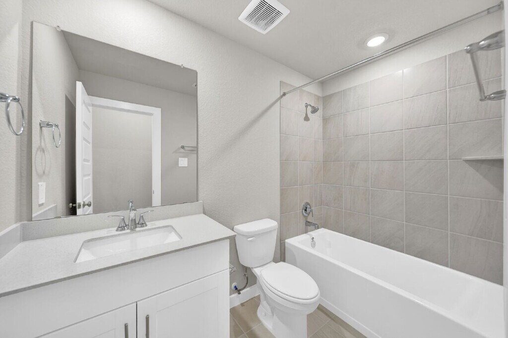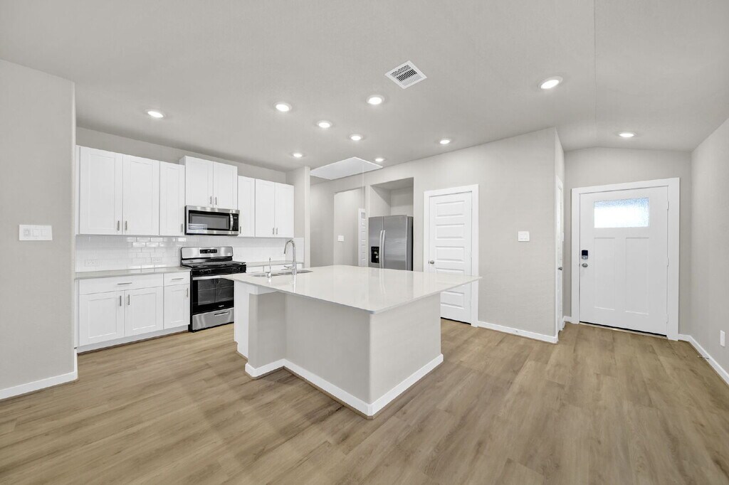 Open-concept layout with kitchen island, kitchen open to family room, and new Whirlpool appliances included (refrigerator, dishwasher, microwave, gas range). Primary bedroom with en-suite bathroom featuring double sink and separate shower with adjoining walk in closet. Secondary bedrooms are sized well featuring carpet and window coverings. Laundry room in home with full size washer and dryer. LOWER utility bills with Energy Star appliances, LED lighting, high-efficiency HVAC (13+ SEER), spray-foam insulation, insulated Low-E windows, and tankless on-demand water heater. Spacious fully fenced backyard with no back neighbors. Mavera subdivision offers a resort-style pool, splash pad, pavilion, cabanas, pocket parks, and walking areas.