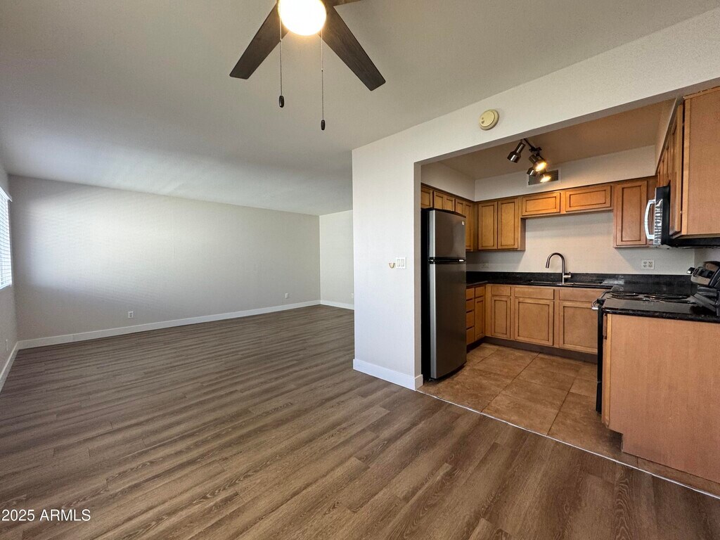 One of the last truly affordable pockets in Central Phoenix! Step inside and you'll find beautiful laminate flooring,abundant natural light,and an inviting open layout. The cozy kitchen offers light wood cabinetry,stainless/black appliances,dual sinks,and granite countertops. The roomy bedrooms provide ample space for sleeping,studying,or storage,and the bathroom features granite counters and a shower/tub combo. Enjoy your own private balcony,perfect for unwinding after a long day. The community and surrounding area carry a classic mid-century modern vibe. Conveniently located just a short walk to the Light Rail and minutes from Christown Mall,Downtown,and Uptown Phoenix!