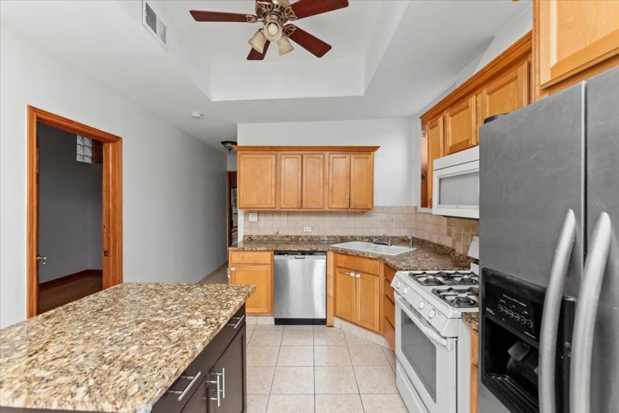 APS92887785 - 2nd Floor in a three-flat brick building on a tree-lined street. Unit features living room with modern decorative fireplace, and an office space! Modern eat-in kitchen with granite counters (stove, dishwasher, microwave, door by door refrigerator) plus in-unit laundry and central air. A sliding glass doors in the rear lead to the very large deck. Just down the block from The 606, and conveniently located near the Western Blue Line stop and all of your favorite Humboldt Park, Logan Square, Bucktown and Wicker Park restaurants, shops and cafes!