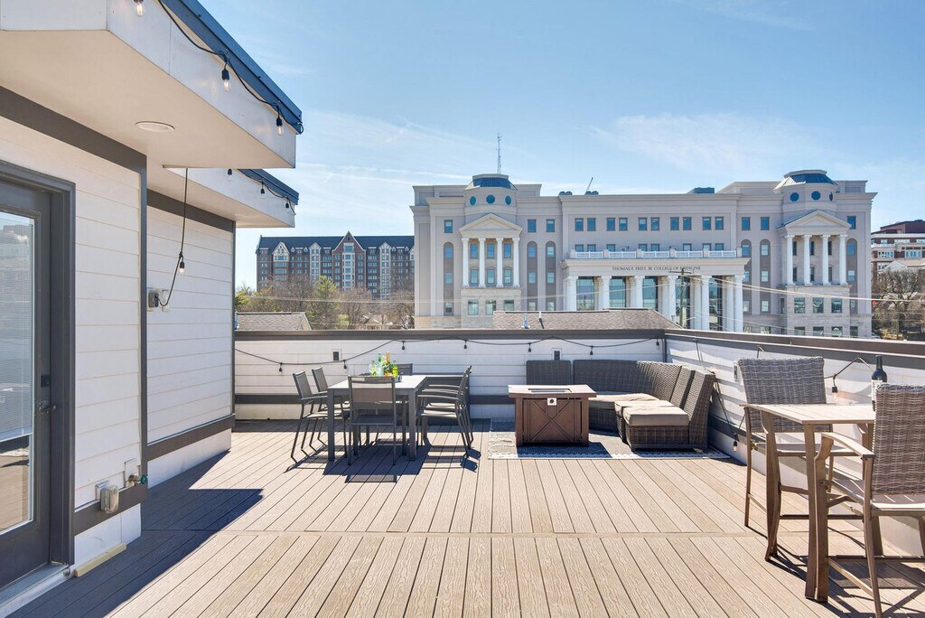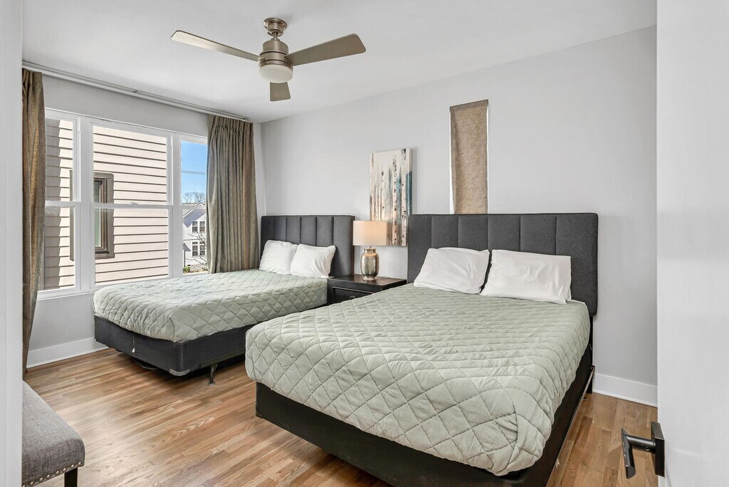 Feel at home in this modern Nashville residence, perfect for groups visiting Music City. Located just minutes from Belmont University and less than 2 miles from Lower Broadway, Nissan Stadium, Bridgestone Arena, and the iconic Honky Tonks, this home offers convenience and comfort. With 4 bedrooms and 4 baths, a fully stocked kitchen with bar seating, a spacious living and dining area, and a large rooftop patio with a gas fire pit, this property is designed for relaxation and entertainment. Enjoy the added convenience of a washer/dryer, smart TVs, Wi-Fi, and parking options including a two-car garage and driveway. The apartment boasts a fully stocked kitchen with bar seating, perfect for preparing meals and entertaining guests. The spacious living and dining area provides ample room for relaxation and socializing. Enjoy modern amenities such as smart TVs and Wi-Fi, ensuring a comfortable and connected stay. Early bag drop is available upon request for an additional $50, providing flexibility for your travel plans. Explore the vibrant neighborhood with ease, as ride-share options and nearby scooters are readily available. Visit local attractions such as The Cookery, just a 1-minute drive away, or Sadie's Nashville and The Pancake Pantry in Hillsboro Village, both within a 3-minute drive. Discover the historic Belmont Mansion in 4 minutes or take a 10-minute drive to The Parthenon. Guests are required to sign a rental agreement and must be at least 18 years old to rent. Smoking and parties are not permitted on the premises. [SI]