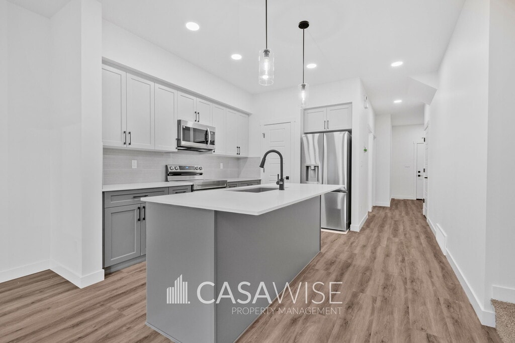 BEAUTIFUL 4-Bed/3-Bath Main Floor Unit With a Double Garage! Enjoy $1000 off your first month's rent when signing a 1-year lease agreement Step into this newly built, thoughtfully designed 1615 sq. ft. main floor unit with modern fixtures and finishes throughout! • Bright open-concept living and dining area. • Stylish kitchen with quartz countertops, ample cabinetry, and prep space. • Primary bedroom includes a walk-in closet and private ensuite. • Three additional generously sized bedrooms offering excellent space for families or roommates. • Two additional full bathrooms featuring contemporary finishes. • Bonus room ideal for a home office, playroom, or additional lounge. • Convenient in-suite laundry. • Durable vinyl plank flooring throughout main living areas. • Comfortable carpet flooring in bedrooms. • Double rear detached garage for security and extra storage space. Snow removal and lawn maintenance are tenant's responsibility. • The basement is being rented out separately. Nestled in the serene community of Marquis, this location offers easy access to Manning Town Centre, Sherwood Park, and Fort Saskatchewan. With Anthony Henday Drive nearby, commuting is effortless, and shopping, dining, parks, recreation, and The Quarry Golf Club are all close at hand. Fixed utility fee of $350/month (includes heat, water, and power). Additional fees may apply depending on the number of occupants. No Pets. No Smoking. Professionally managed by Casawise Property Management Only applications received through our site will be processed: If interested, please provide us with your name, phone number, available times for viewings and a little background about you (when do you need the unit for, how many people would be living in the unit, etc.). Thank you! Note: Seasonal items, including but not limited to landscaping, decks, fences, and sidewalks, are not guaranteed. They are subject to the owner and builder approval, as well as weather conditions and contractor availability. **Disclaimer: Be sure to look this address up on Google Maps.**