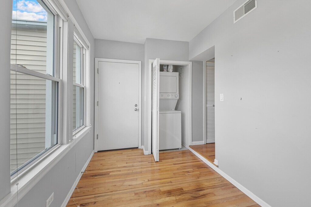 Quiet west Andersonville condo for rent. This apartment is located at the rear of the building, away from Foster Ave traffic and noise. This is an unusual 1 bedroom plus den, with 1 and a half baths, AND it includes in-unit laundry and parking! While the rooms are not huge, they are well laid out for furniture arrangement flexibility. The primary bedroom has room for a king size bed. Lovely outdoor shared green space completes this package. Bike storage in basement common area.