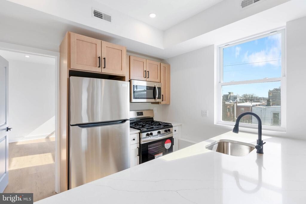 Open House Sunday(3/1) from 10am-10:30am. High-end renovated two bedroom in Point Breeze and the best part, GAS AND WATER ARE INCLUDED IN THE RENT! This beautifully renovated and thoughtfully completed second-floor two bedroom unit offers a bright, comfortable layout with elevated finishes throughout. Both bedrooms include large closet space and private ensuite bathrooms, creating an ideal setup for roommates or anyone who values extra privacy. The kitchen features tuxedo cabinetry, sleek finishes, gas cooking, and a dishwasher, opening into a dining and living area that feels wide, open, and inviting. Stacked laundry is conveniently located within the main living space. A small deck sits just off the rear bedroom, offering an easy outdoor escape, and as a corner unit, the home is filled with natural light throughout the day. The property is equipped with energy-efficient central air and heating systems for year-round comfort. Point Breeze offers easy access to local parks, neighborhood cafés, major bus routes, and the subway just nine blocks away, creating a convenient and walkable setting.