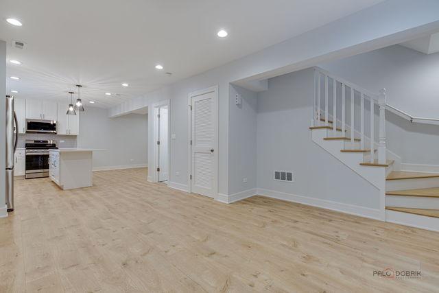 APS92760485 - Welcome to your sun-filled, east-facing retreat in the heart of Logan Square! This fully renovated 2-bedroom, 2-bathroom home blends space, style, and modern comfort, just steps from the 606 Trail. Step inside through your private entrance into a bright, open-concept living and kitchen area, where bay windows invite in abundant morning light. The updated kitchen boasts sleek quartz countertops, stainless steel appliances, a large island with seating, and soft-close cabinetry, perfect for cooking, entertaining, or simply enjoying a quiet morning at home. Toward the back of the unit, a versatile nook offers the perfect spot for a dining table or home office setup. Both bedrooms are generously sized, easily accommodating queen beds along with nightstands and dressers. The primary bedroom includes a private en-suite bathroom with a walk-in shower, while a second full bathroom with a soaking tub and in-unit laundry adds convenience and comfort. Additional features include wide-plank hardwood floors throughout, central heating and A/C, and extra storage in the basement. Ideally located on a tree-lined street near parks, restaurants, shopping, and public transit, this home offers the best of Logan Square living in a beautifully updated package.
