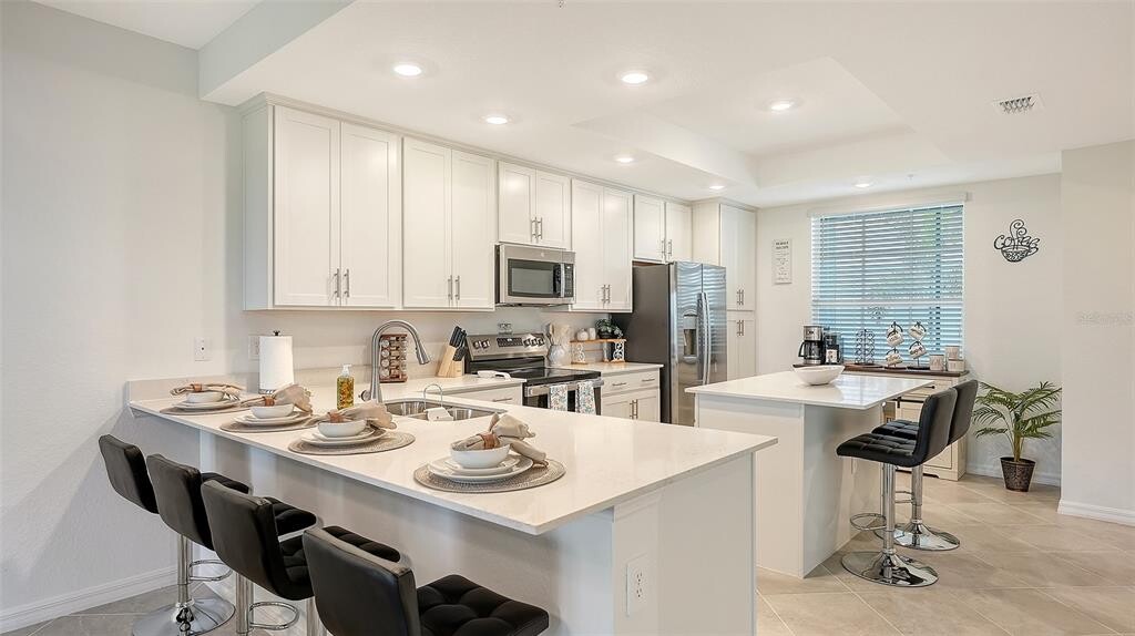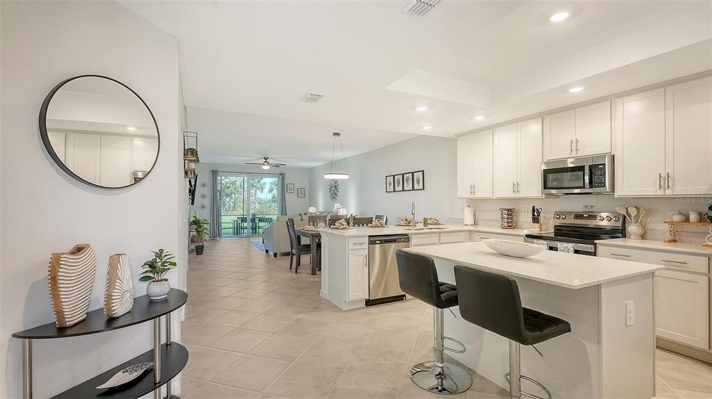 Gorgeous professionally decorated Arabella II end unit on the first floor in the premier Golf Community of Wellen Park Golf & CC. This clever open floor plan is the largest of the Veranda Homes featuring 1,569 sq. ft. of well thought out living space,1,886 including both screened in lanai's on the front of the condo and the back. This home also offers a den with a desk and a queen size sofa bed that can be used as an office or additional guest quarters. This home has been professionally decorated with coastal chic furnishings and a soothing color pallette. Master bedroom features an en-suite bath with double sinks walk-in shower and closets. Guest room is located at the front of the home and offers a queen bed. This home is well stocked with all the comforts of home including a coffee bar. Enjoy morning coffee and evening meals on your screened in lanai. Entertain guests and enjoy hours of entertainment as you watch players navigate this new and exciting Gordon Lewis designed 18- Hole Championship Golf Course! Just a short walk to the Tiki bar for a bite and refreshments. Come and experience resort style living in Wellen Park's newest golf Community! Amenities will include: TIKI BAR WITH POOLSIDE FOOD & BEVERAGE SERVICE,FITNESS CENTER,RESORT STYLE SWIMMING POOL,THREE SATELLITE POOLS,TENNIS AND BOCCE COURTS AND MORE! Golf Membership transfer available. $65.00 monthly min. expenditure is required at the on-site Tiki Bar/Restaurant (Alcohol Excluded). Easy access to I-75,shopping,dining,Farmers market,live music and more in downtown Wellen Park. Close proximity to the Cool Today Atlanta Braves Stadium,gulf beaches and downtown Venice,THIS FURNISHED PROPERTY IS AVAILABLE FOR A LONG OR SHORT TERM RENTAL- All utilities paid with monthly cap. Includes WIFI,cable and electricity. MLS# A4628963