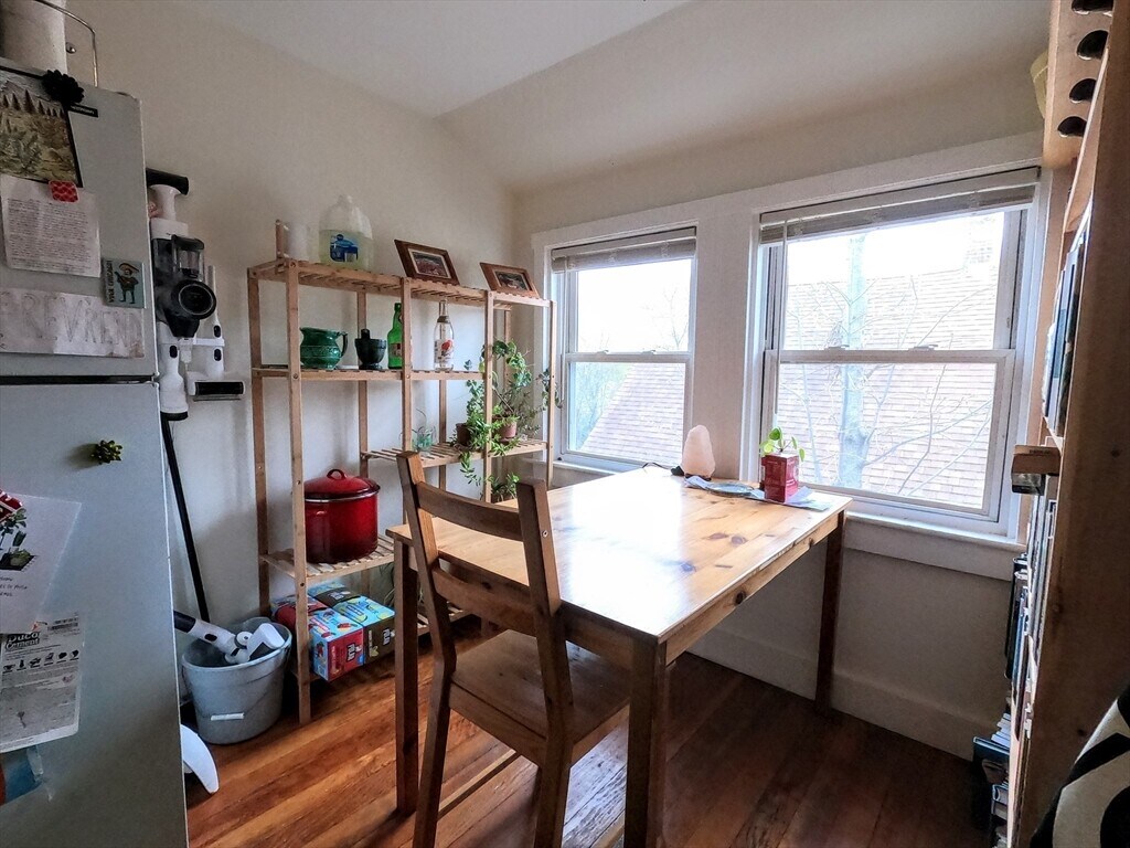 HEART OF ROSLINDALE SQUARE...Four room 1+ bedroom! Less than a five minute walk to Rozzi Village shops, Commuter Rail, and restaurants. Light and bright, this unit has beautiful wood floors throughout. Large living room and Dining room with built in period hutch plus faux stained glass window. Eat in kitchen with large pantry, stainless fridge, stainless gas stove, and stainless dishwasher. Gas hot water radiator heat (2015) with insulated windows throughout. Ample street parking (no sticker required!). Owner will consider a cat. New porch (2017), fenced in yard, & basement with coin-op laundry. 1000ft from Roslindale Village including Commuter Rail, buses, restaurants, bakery, and supermarket. Quick access to Arnold Arboretum, Jamaica Plain, highways, Dedham's Legacy Place, & Costco.