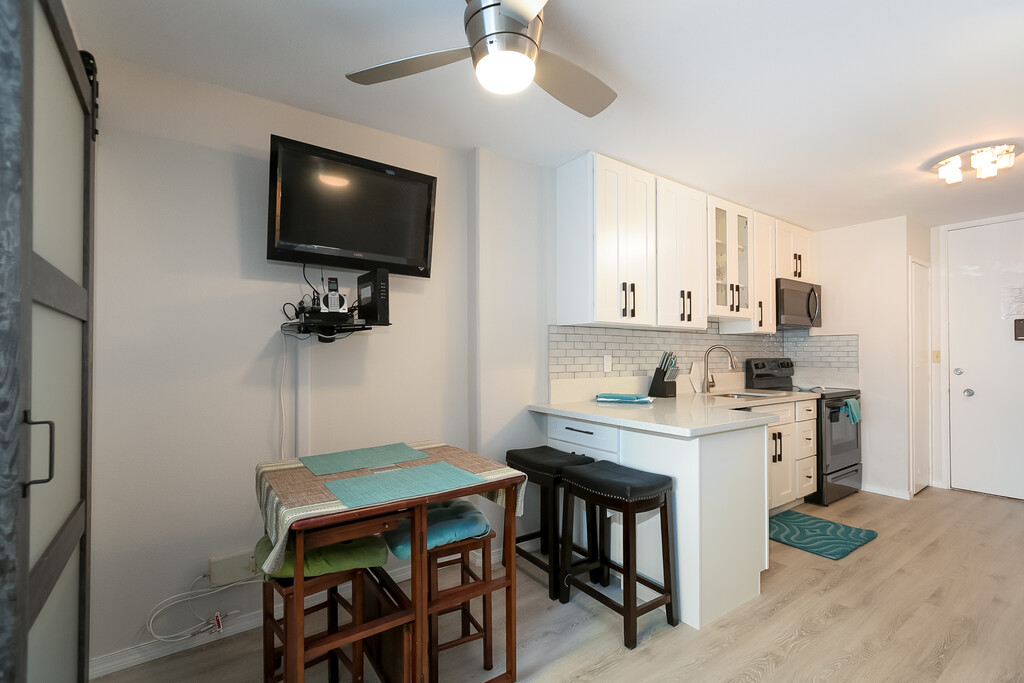 Legal vacation rental unit is AVAILABLE NOW for weekly and monthly rentals ( under 179 consecutive das stay). No future dates are being accepted at this time. No in-person showings are offered for vacation rentals, sorry. However, a video tour of the condo interior is available upon request. In your inquiry pls indicate your exact rental dates and the number of people in your party. TOTAL DESIGNER RENOVATION ! NO EXPENSE SPARED! CLEAN MODERN APARTMENT FOR YOUR VACATION AND LONGER TERM STAYS at seasonal rental rates + applicable local taxes. Superb Location next to the water! Completely remodeled with no expense spared! Vinyl plank flooring in all living areas, designer tile work in the bathroom. All modern high end finishes CLEAN, quiet, breezy city and mountain views suite at the well renowned Ilikai Marina. Efficient apartment lay out, 2 TV sets with free cable service. Free Wi-Fi and phone service. Water front building right on the Waikiki Marina. Property is conveniently located at the entrance to Waikiki- close to Ala Moana Shopping Center, Hilton Lagoon, Beach, Magic Island and Honolulu Convention Center. New queen size bed and comfortable full size sofa-bed, sleeps a total of up to 3 people. Ideal for up to 1-2 adults and 1-2 children, or up to 3 persons in total. Space efficient dining set. Full kitchen completed with black stainless steel appliances and lots of cabinet storage space. Central AC in the building Community app operated laundry in the building Parking in the downstairs garage for additional fee: $33/day fee. Monthly passes are available for $180/mo for building guests with a min of 3mos rental agreement. All parking fees are payable directly to the parking garage authorities. A few restaurants on the ground floor: Chart House, Red Lobster and Harbor Pub. Discovery Bay center, ABC store and McDonalds are across the street. Japanese Stake House, Hilton Hawaiian Village and many other eateries are just and down the street. This condo is a legal vacation rental where we accept short term reservation requests for less than 6mos in duration at a time. Rental rates START from $169/nt+17.96% HI TA Tax during off seasons. Discounted monthly rates START from $3100/mo+ applicable local taxes during off season months. Prime winter/holiday season monthly rates start from $3700/mo+17.96% HI Tax This is short term rental. Strictly no subleasing, Non Smoking and No pet property.