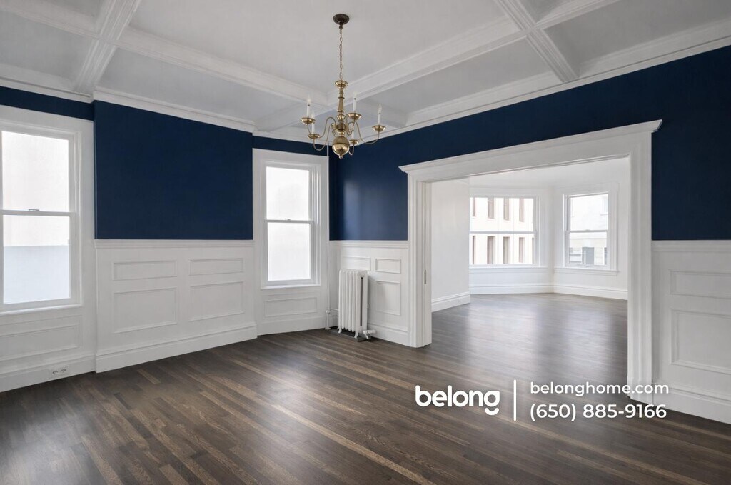 Refined details and generous proportions establish a sophisticated environment for living in this elegant 2-bedroom, 2-bath home. High vaulted ceilings lend an airy sense of volume, while rich flooring and classic trim bring polish to every room. The overall feel is elevated yet comfortable, with architectural character that quietly stands out. The living and dining areas flow naturally, offering flexibility for both entertaining and everyday routines. In the dining space, a statement chandelier and coffered ceiling create a formal backdrop, complemented by a built-in cabinet that adds both charm and function. Just beyond, the kitchen pairs crisp cabinetry with a patterned backsplash and stainless appliances. Your primary bedroom feels especially inviting, highlighted by bay windows that draw in natural light and frame the space beautifully. Both baths are thoughtfully finished, with the primary bath featuring striking tilework, a sleek vanity, and a shower-tub combination that balances style and practicality. Set in the heart of San Francisco, this home places you close to everyday essentials and neighborhood favorites. Grocery options like Trader Joe’s, Whole Foods Market, and Safeway are nearby, along with cafés, restaurants, and shops along Polk Street. For fresh air and scenic views, Lafayette Park offers a welcome green escape just moments away. *Our homes come as-is with all essentials in working order. Want upgrades? Request it through the Belong app, and our trusted pros will take care of the rest!