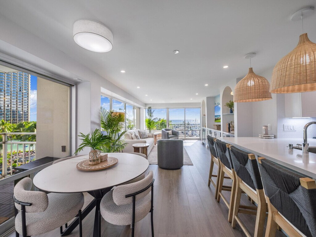 Experience the beauty of Waikiki and feel at home in this modern 2-bedroom, 2-bathroom condo located on the 4th floor of the Ilikai Hotel. This 1,240 sqft condo with a balcony offers amazing views of the sunset over the ocean, as well as views of the marina and pool. This thoughtfully furnished condo features an open floor plan with lots of natural lighting and air conditioning throughout. The kitchen is fully equipped with a stove/oven, microwave, dishwasher, full-size refrigerator with ice maker, garbage disposal, and Elkay water filter. Enjoy access to two swimming pools. The rental includes bed linens, bath and beach towels, dishes, silverware, cookware, a hair dryer, iron, and ironing board. A starter kit with paper towels, toilet paper, 1oz shampoo, 1oz conditioner, bath soap, hand soap, and liquid dish soap is provided. Valet parking service is available through the hotel for $45 per day (price subject to change). Luggage storage is available before check-in and after check-out at the lobby Bell Desk for $2 per bag (price subject to change). The property's location is highly convenient, with the beach just a 4-minute walk away and the Ala Moana Shopping Center, one of the largest outdoor malls in the country, just a 10-minute walk away. Don't miss the Friday night fireworks display starting at 7:45 pm, viewable from the Hilton Hawaiian Village lagoon, just a 4-minute walk. Building Notice: Spalling repairs and full exterior painting of the building have officially started. Balcony access for this condo will be restricted from June 29, 2026, to November 20, 2026 (approximate dates). However, after 5 p.m., the balcony will be accessible, but no furniture will be allowed as we're required to remove it for painting. There may be noise disturbances. Check-in is at 3 p.m. and check-out is at 11 a.m. To guarantee a late check-out, you must reserve the condo for the night of your departure. Housekeeping service, replenished towels or toiletries, condiments/spices, coffee, detergent, beach chairs/umbrellas/toys, or a cooler are not provided. Registration Number: TA--01 [SI]