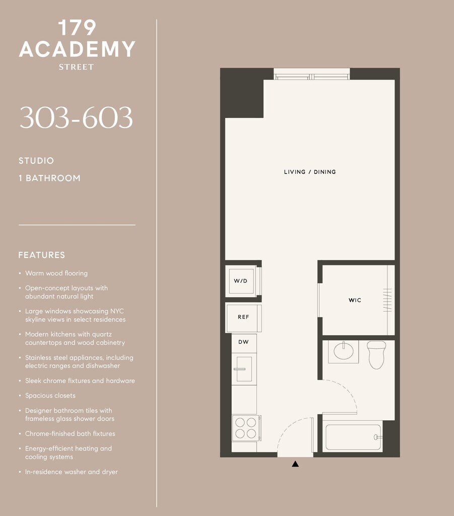Spacious southern-facing studio with huge walk-in-closet! Live at 179 Academy—where thoughtful design and modern amenities create an easy, balanced lifestyle. Enjoy open layouts, warm finishes, and large windows that fill your home with natural light. Each apartment features quartz countertops, stainless steel appliances, and smart, stylish details throughout. Residents have access to a rooftop lounge and terrace with skyline views, a fully equipped fitness center, and secure package room—all within a controlled-access building with elevator access. Now leasing—schedule a tour today! *Photos are representative of the unit.* The advertised rent is the net effective. The gross monthly rent is $2,275 with 2 months free on a 16 month lease.