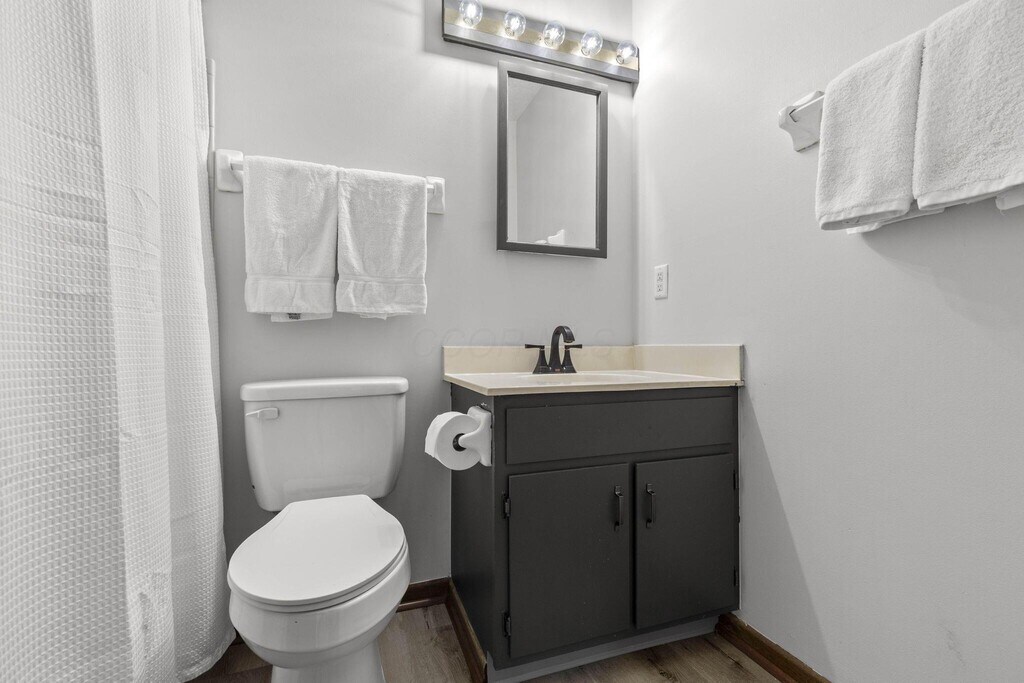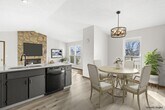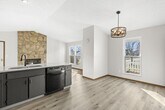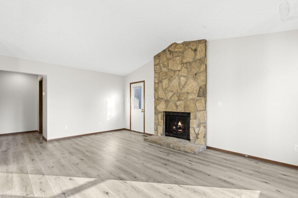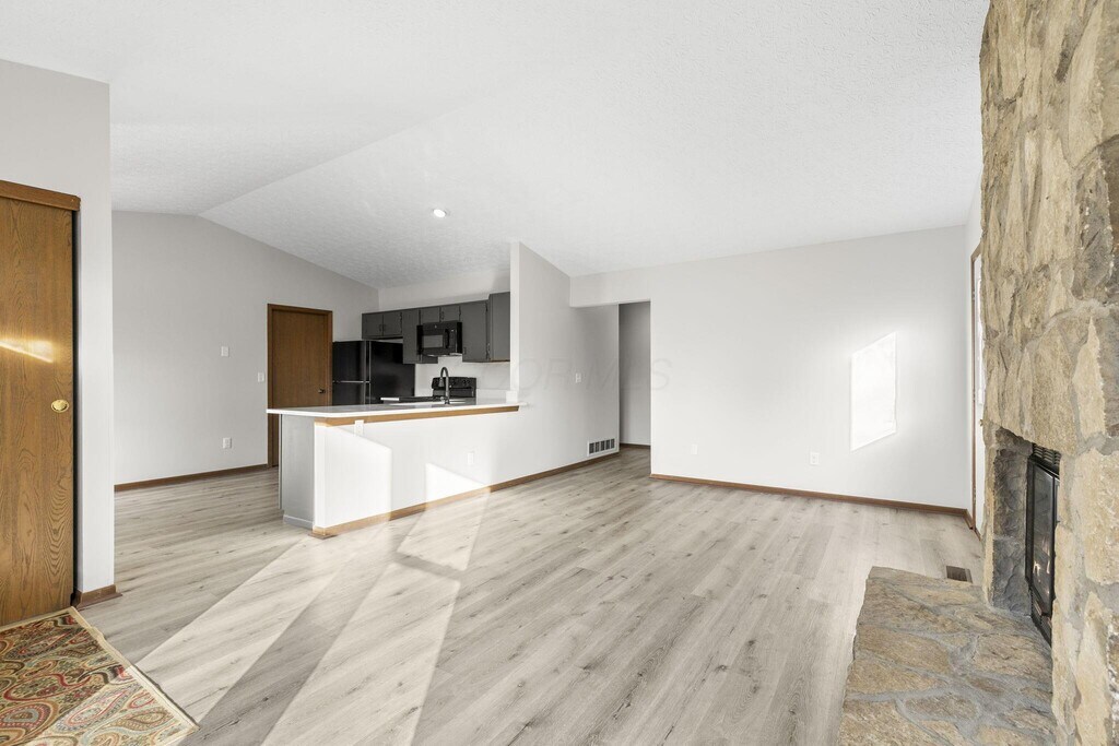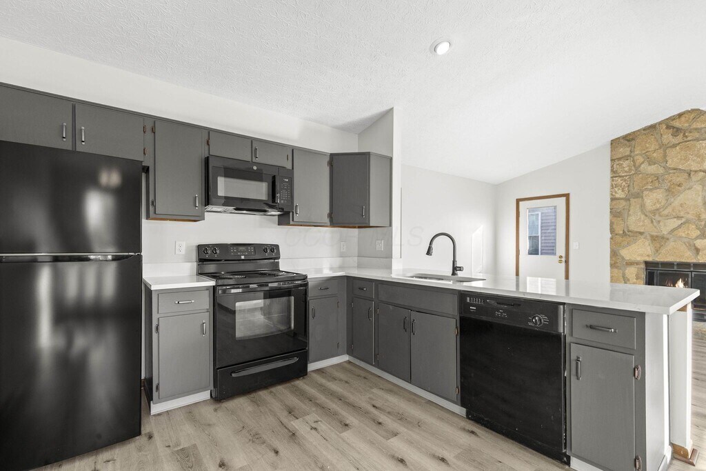 Welcome home to this well-designed 3-bedroom, 2-bath ranch offering 1,209 square feet of comfortable, modern living. The open-concept great room features a striking floor-to-ceiling stone fireplace and flows seamlessly into the updated kitchen—perfect for everyday living and entertaining. The kitchen boasts quartz countertops, gray cabinetry, black appliances, bar seating, and an inviting eating space. Luxury vinyl plank flooring enhances the kitchen, great room, and baths, adding style and durability. The private owner's suite includes a walk-in closet and en suite bath, while two additional bedrooms offer flexibility for guests or a home office. A convenient first-floor laundry, attached 1-car garage, and a spacious backyard complete this move-in-ready home ideal for relaxing or hosting outdoors.