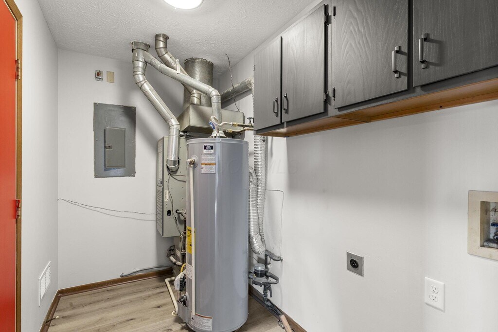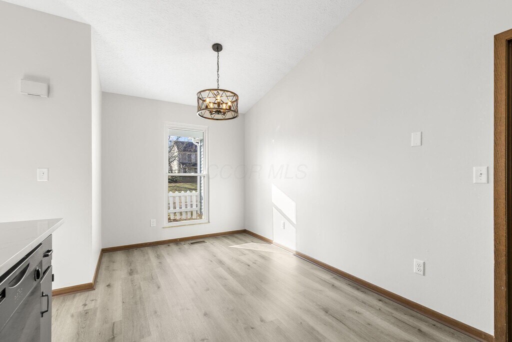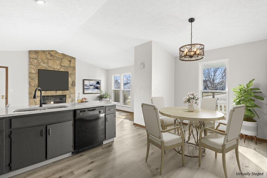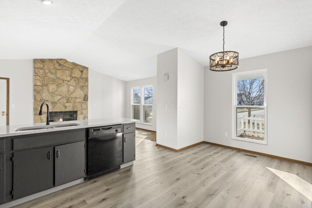 Welcome home to this well-designed 3-bedroom,2-bath ranch offering 1,209 square feet of comfortable,modern living. The open-concept great room features a striking floor-to-ceiling stone fireplace and flows seamlessly into the updated kitchen—perfect for everyday living and entertaining. The kitchen boasts quartz countertops,gray cabinetry,black appliances,bar seating,and an inviting eating space. Luxury vinyl plank flooring enhances the kitchen,great room,and baths,adding style and durability. The private owner's suite includes a walk-in closet and en suite bath,while two additional bedrooms offer flexibility for guests or a home office. A convenient first-floor laundry,attached 1-car garage,and a spacious backyard complete this move-in-ready home ideal for relaxing or hosting outdoors.