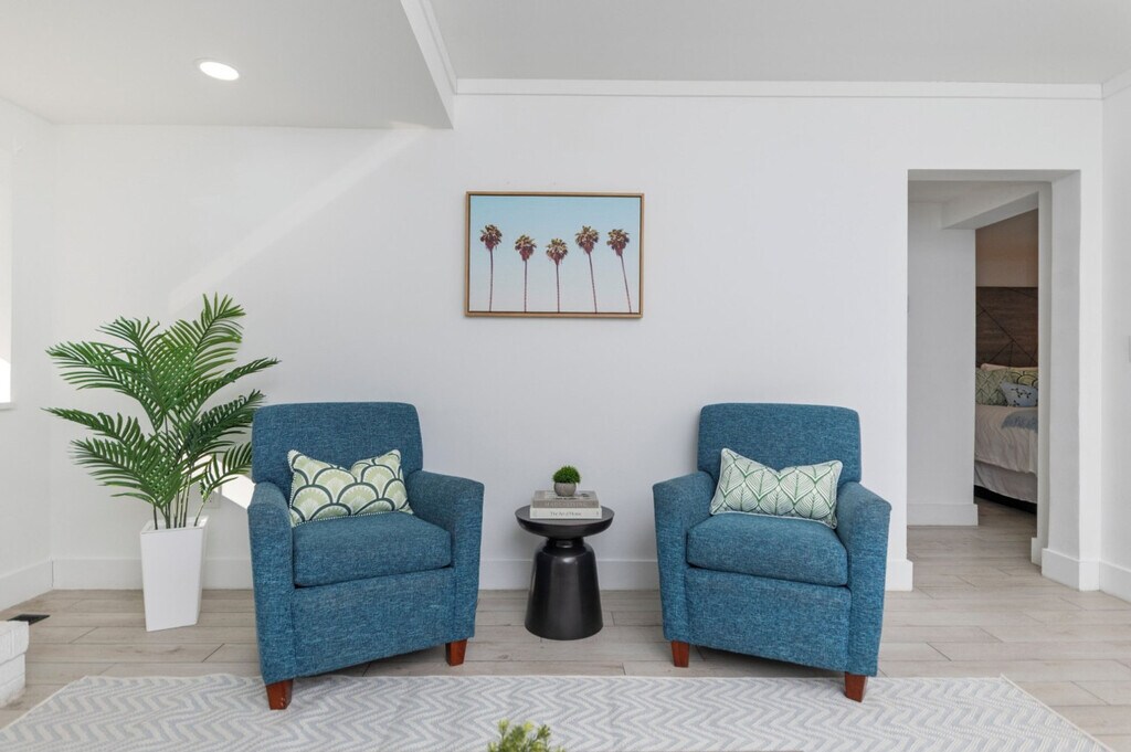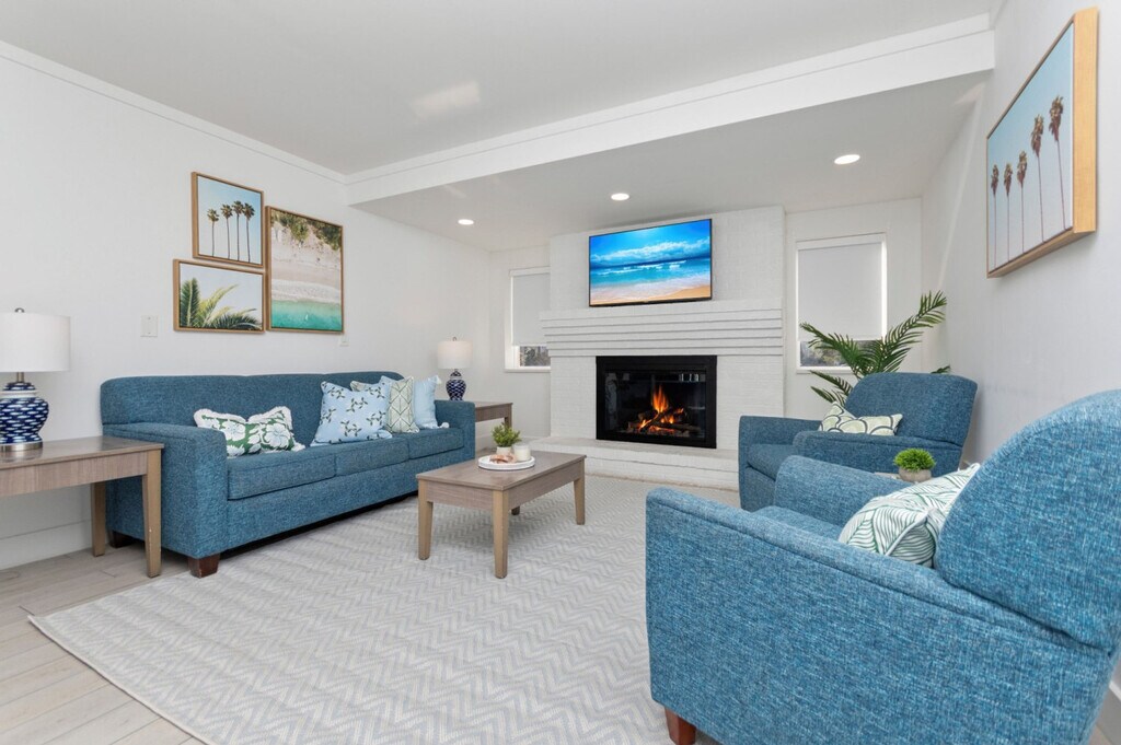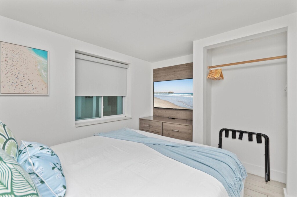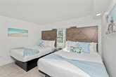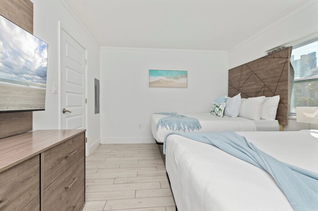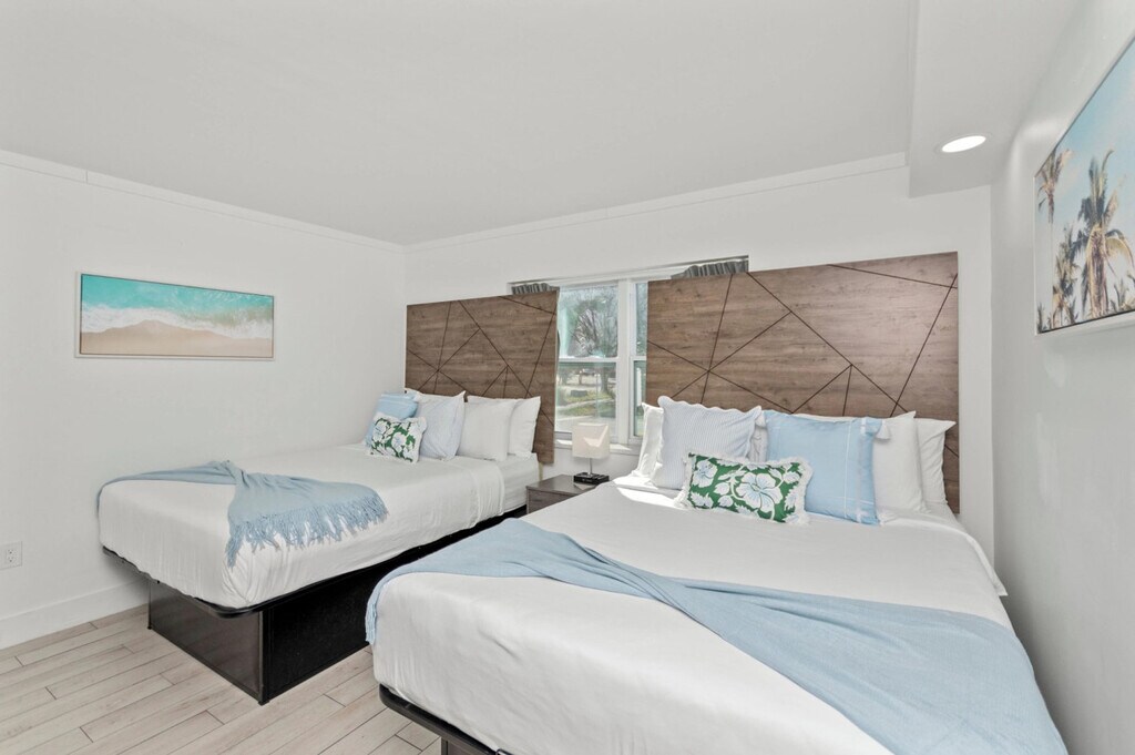 Feel at home in this spacious 2-bedroom suite, ideal for larger families or groups. The suite includes a full kitchen equipped with a full-size refrigerator, stove, oven, microwave, and basic cookware. Added comfort and convenience are provided by a private bathroom, smart TVs, air conditioning, and high-speed Wi-Fi (100+ Mbps). This 2-bedroom suite features three queen beds across two private bedrooms, plus a sofa bed in the living area, comfortably accommodating up to 8 guests. Located just a three-minute walk to the beach, guests also enjoy access to Fin’s Inn shared amenities, including the seasonal outdoor pool and the on-site game room with arcade games and foosball. The layout offers plenty of room to relax after a day at the beach while keeping everyone together under one roof. [SI]