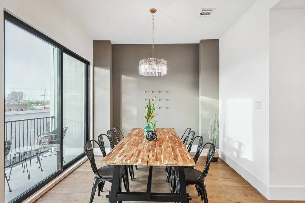 This luxurious vacation home in Dallas offers four floors of elegant living, complete with a roof garden and breathtaking views of the Dallas skyline. With three bedrooms and 3.5 bathrooms, this home is designed for comfort and entertainment. Located near top attractions like the Dallas Convention Center, you'll feel at home in this vibrant neighborhood. Experience the epitome of modern luxury with a fully equipped kitchen featuring stainless appliances, a kitchen island with stool seating, and all the essentials for your culinary adventures. The dining area offers a dedicated space for meals with stunning skyline views, while the living room provides a sleek and sophisticated setting for relaxation and socializing. The bedrooms are curated for comfort, ensuring sweet dreams with plush mattresses and crisp linens. Enjoy complimentary parking in the garage and bring your furry friends along for a pet-friendly stay with a non-refundable pet fee of $150 per pet. An additional nightly rate applies for more than six guests, and small gatherings are allowed upon request and approval. Situated in one of Dallas' most vibrant neighborhoods, this home is less than a mile from downtown and within walking distance to popular spots like the Dallas Convention Center and The Cedars. Enjoy the convenience of being close to a variety of attractions, from museums and performing arts venues to lively bars and restaurants, all contributing to the city's unique vibe. This property enforces a strict no-smoking policy with a $450 fine for violations, along with costs for cleaning and repairs. Check-in is at 4pm and check-out is at 10am. Parties or large gatherings are not allowed, and noise levels are monitored to ensure a peaceful environment. Pets must be house-trained and kept off furniture, and any pet-related cleaning fees will apply. Registration Number: 575098