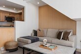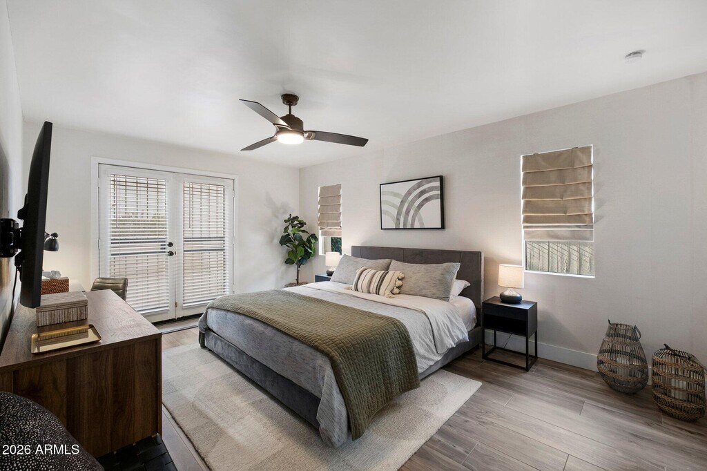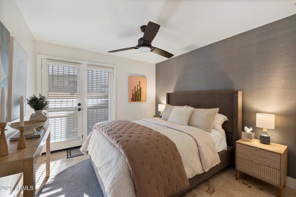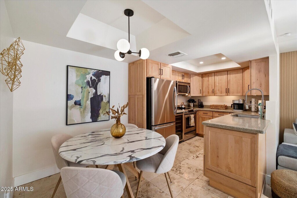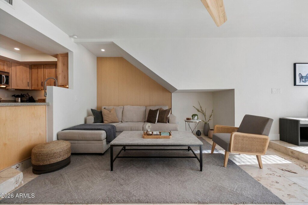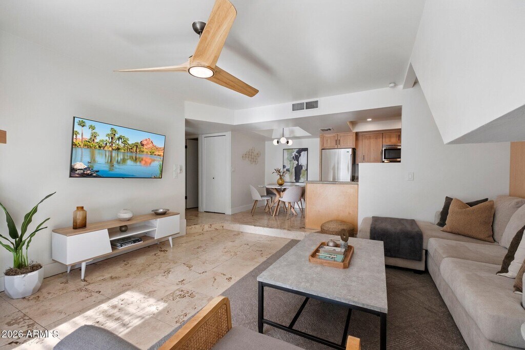Introducing a relaxing luxury condo retreat in highly desirable North Central Phoenix,close to everything the city has to offer. This fully furnished,recently remodeled 2-bedroom,2-bath residence features travertine flooring and tile throughout. The oversized primary suite offers a king-size bed,50'' TV,desk,dresser,walk-in closet,and glass-enclosed shower. The guest bedroom includes a queen bed,built-in closet storage,and direct access to the expanded patio. The inviting living area features generous seating,a second 50'' TV,quartz-tiled fireplace,and queen sleeper sofa. Just steps from the heated pool and spa,with hiking trails nearby.