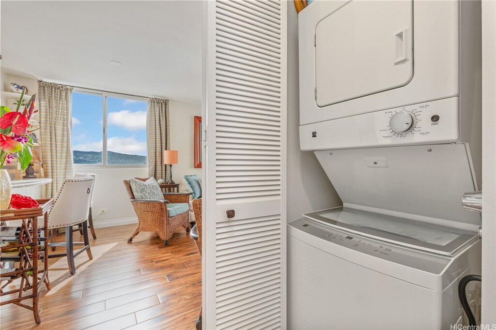 Rare high-floor corner unit with breathtaking panoramic views of the Ala Wai Canal, ocean, and Honolulu Harbor. Enjoy in-unit washer/dryer, dedicated parking stall, and resort-style pool access. Steps from Waikiki’s beaches, Ala Moana Center, dining, and entertainment. Elevated, convenient island living—your perfect Hawaii home awaits! Ceiling Fan Disposal Dryer Patio/Deck Pool On Property Range/Oven Resident Manager Security Guard Smoke Detector Trash Chute