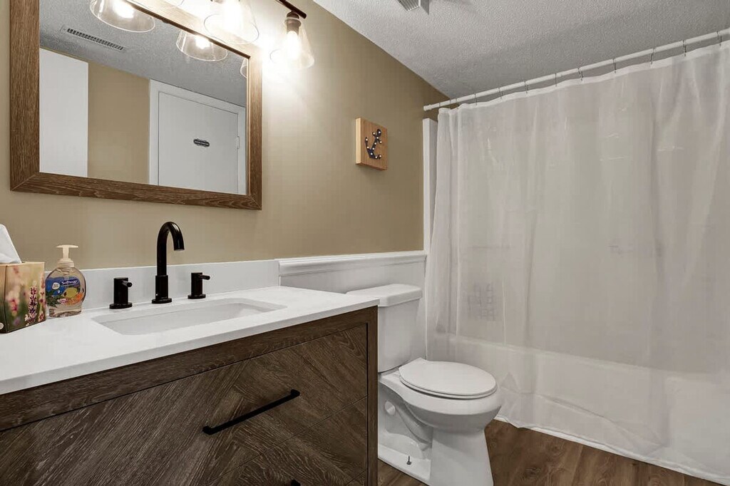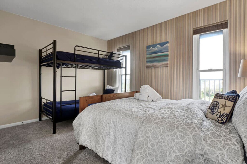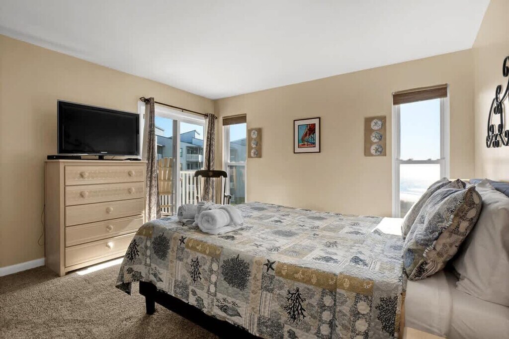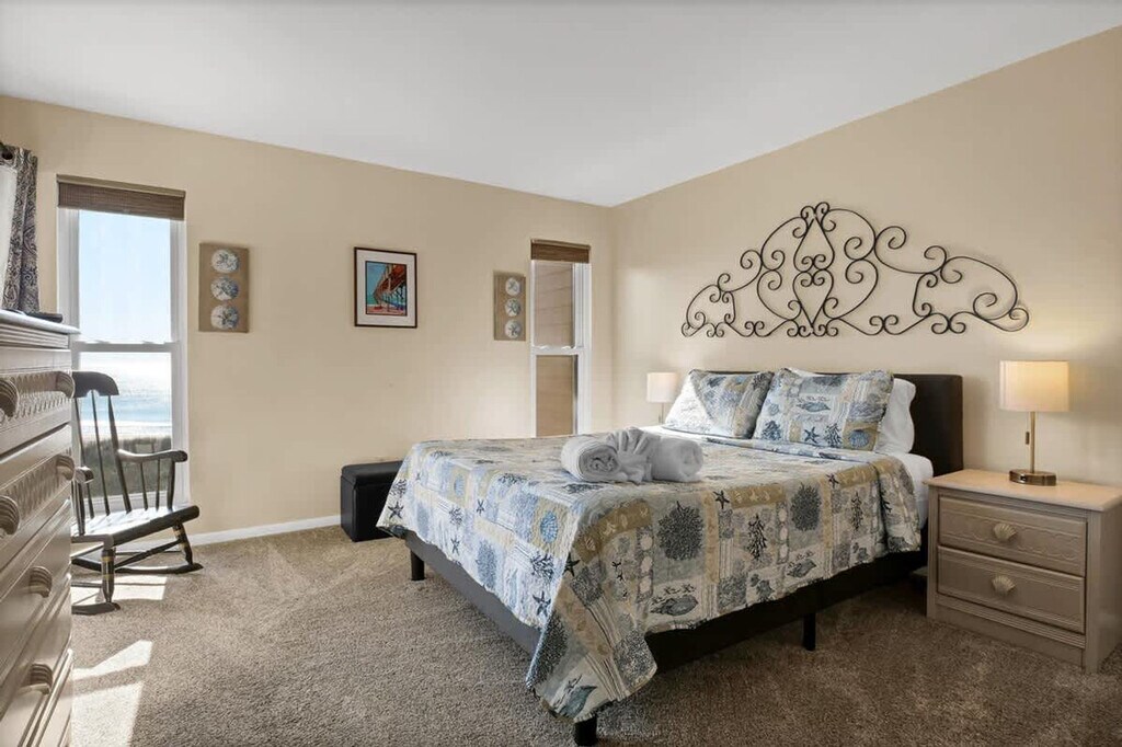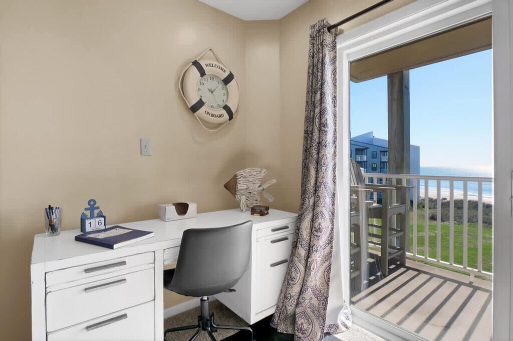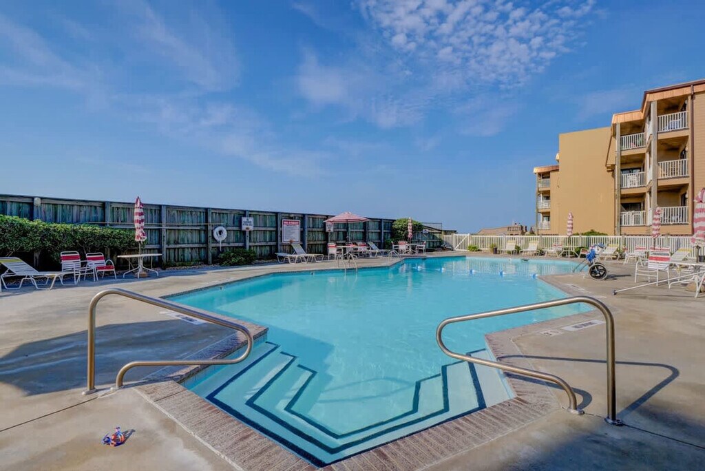 Welcome to Seascape, a beachfront property offering breathtaking sunset views and a perfect beach vacation experience. This two-bedroom apartment features a queen bedroom with a full master bath and a second bedroom with a twin-over-twin bunk bed and a full-size bed. Feel at home with a fully equipped kitchen and a dedicated desk space for remote work, all enhanced by free high-speed Wi-Fi. Enjoy the stunning views of dolphins and boats from the balcony. Seascape is designed for relaxation and enjoyment, ensuring you have everything you need for a memorable stay. The apartment comfortably sleeps six guests with its queen bedroom and cozy bunk room for kids. The fully equipped kitchen is stocked with everything needed to prepare meals, making it perfect for whipping up tasty dishes. The dedicated desk space and free high-speed Wi-Fi make it ideal for remote work. HOA-controlled pools are available for guest use from Memorial Day weekend through Labor Day weekend. Openings outside of this time will be at the discretion of the HOA. Experience the beauty of North Topsail Beach with direct beach access for sunbathing and water activities. The serene environment is perfect for families looking for a beach retreat. Enjoy nearby basketball courts and a playground for family fun. For those seeking adventure, beautiful Wilmington is just 40 miles south, offering museums, the Battleship North Carolina, Fort Fisher Aquarium, and a variety of dining options, perfect for a rainy day excursion. Quiet hours are between 21:00 and 8:00. The minimum age requirement for booking is 18. Includes a dedicated desk space for remote work with free high-speed Wi-Fi, ensuring comfort and convenience as you tackle your tasks. [SI]