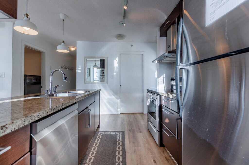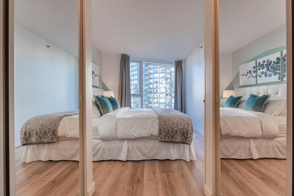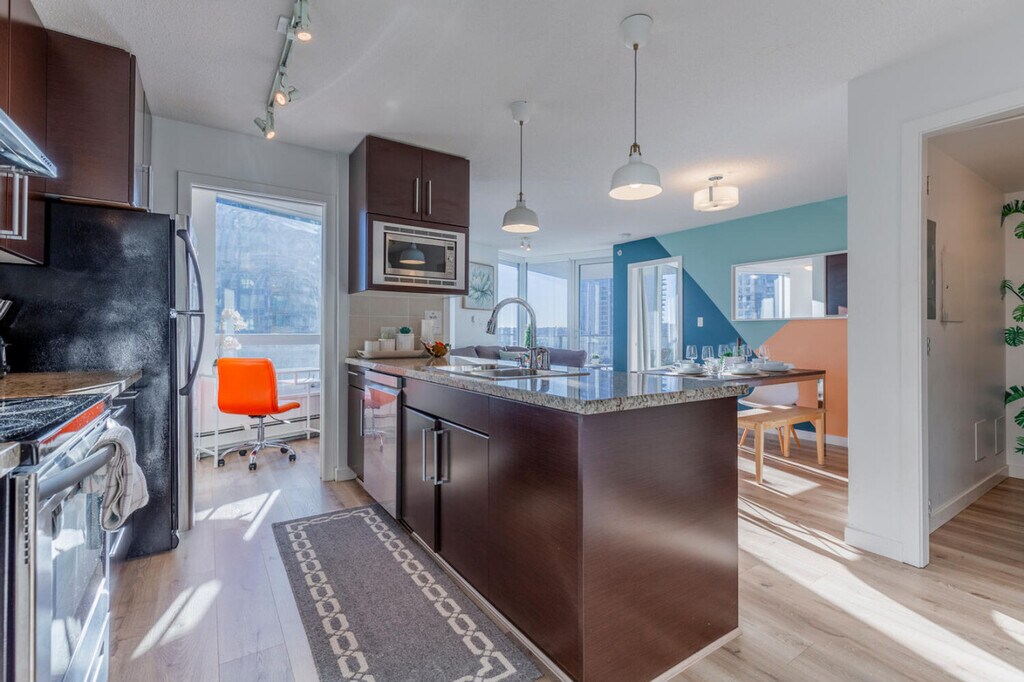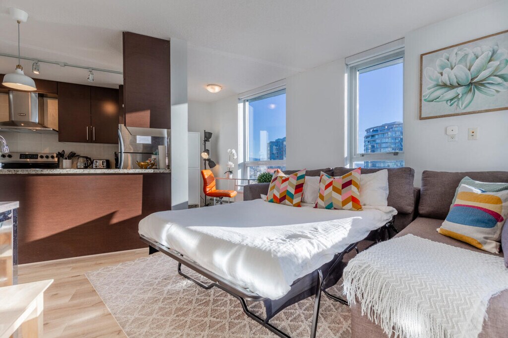 Feel at home in this modern 2-bedroom, 2-bathroom condo located in the heart of Vancouver, offering stunning city and mountain views. This unit features a full kitchen, ensuite laundry, a private balcony, and included parking, making it perfect for those seeking comfort and convenience in a vibrant downtown location. With a minimum 90-night stay, it caters to mid-term guests. Smoking, parties, and events are not allowed in this property. Additionally, guests are requested to keep noise to a minimum after 10 PM. [SI]