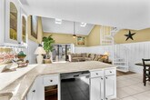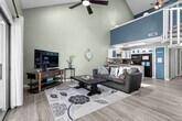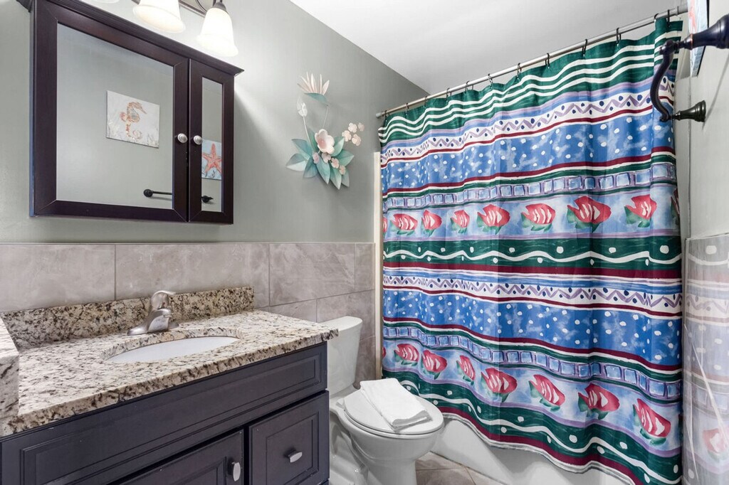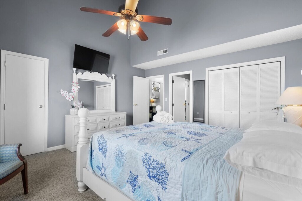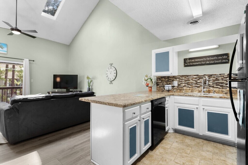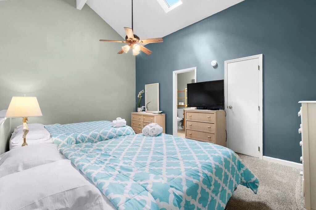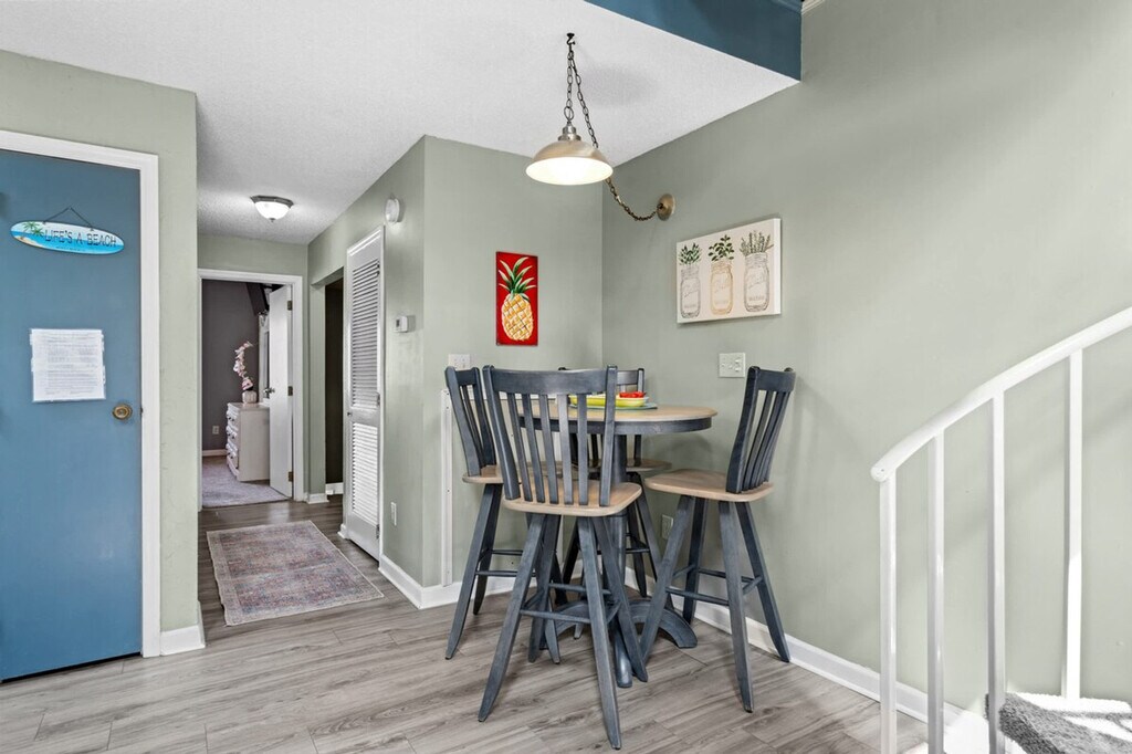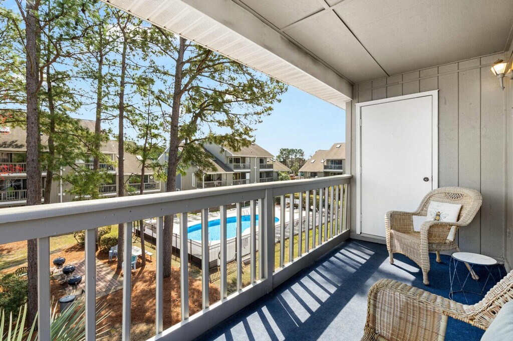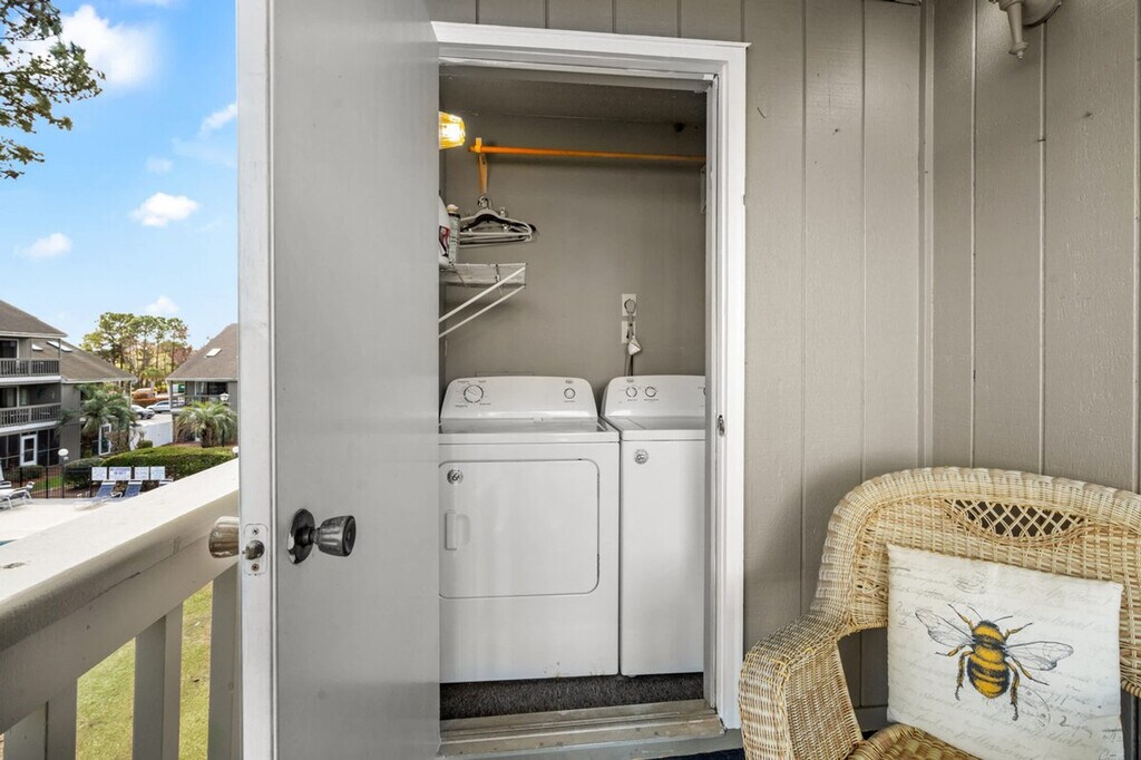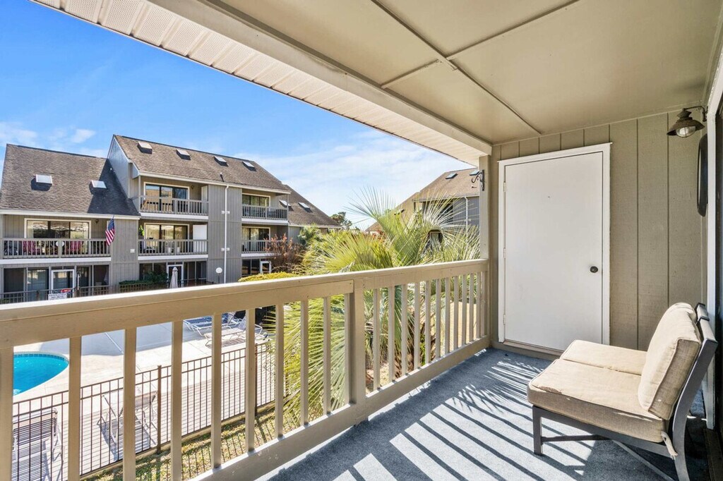 Feel at home in this 1200 sqft, 3rd-floor condo in Surfside. This apartment features one primary bedroom and an upstairs loft bedroom. Rudy's Reel 'Em Inn features a fully stocked kitchen and dining area with bar stools for additional seating. The downstairs master suite contains a king-size bed, a private en suite bathroom with hallway access, and a large closet. The open-plan living area with vaulted ceilings contains tons of natural light from the skylights. Step out onto the covered balcony which overlooks the pool. A full-size washer and dryer are in the utility closet for any laundry needs. Upstairs, you will find the loft suite with two queen beds, a walk-in closet, and a private en suite bathroom. Linens for all beds, bath towels, hand towels, wash cloths, a roll of paper towels, two rolls of toilet paper per bathroom, hand and dish soaps, and two laundry and dish pods are provided. It is recommended that you bring pool/beach towels and rent beach umbrellas and chairs locally. Enjoy a relaxing, spacious covered balcony surrounded by shade trees, giving you a cool bird's eye view of the pool and courtyard to sit and relax, taking in those gorgeous South Carolina sunsets. Guests must be 25 or older to book. Routine pest control treatment may be scheduled during your stay, typically occurring on the second Tuesday of each month. The technician will knock before entering and will complete the treatment in just a few minutes. A fine may be applied if entry is refused. No smoking or pets are permitted inside the condo. [SI]