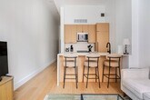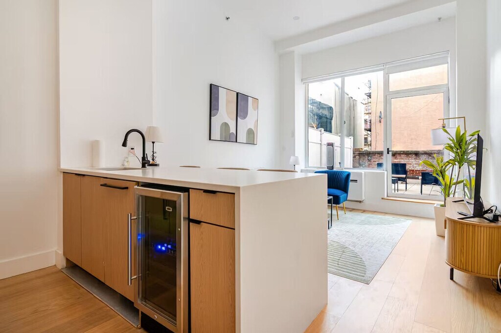 The advertised rate of $8,499/month is the lowest available price, based on a 1 month(s) stay with a move-in date of September 4, 2026. Rates vary depending on the duration of stay, season, and other parameters. For exact pricing and additional pricing components, please visit our website and enter your desired move-in and move-out dates. The rate is applicable when billed upfront; it can be higher if billed in multiple payments. Experience elevated city living and feel at home in this stunning top-floor residence near Cooper Square. Designed for comfort and style, this apartment offers a seamless blend of modern finishes and thoughtful details, ideal for both short-term and extended stays. The building has an elevator for easy access. This apartment features high ceilings and abundant natural light. The chef’s kitchen boasts marble countertops and backsplash, Bertazzoni and Bosch appliances, and an island kitchen layout. Enjoy the convenience of a washer and dryer in the unit, as well as a dishwasher, built-in air conditioning and heating, custom cabinetry, electric shades, a spa-style marble bathroom with double sinks and premium fixtures, and new hardwood floors for a warm, polished feel. On-site laundry room is available. This centrally located apartment is just steps from some of the city’s best dining, nightlife, and culture. The building has a virtual doorman for added security. [SI]