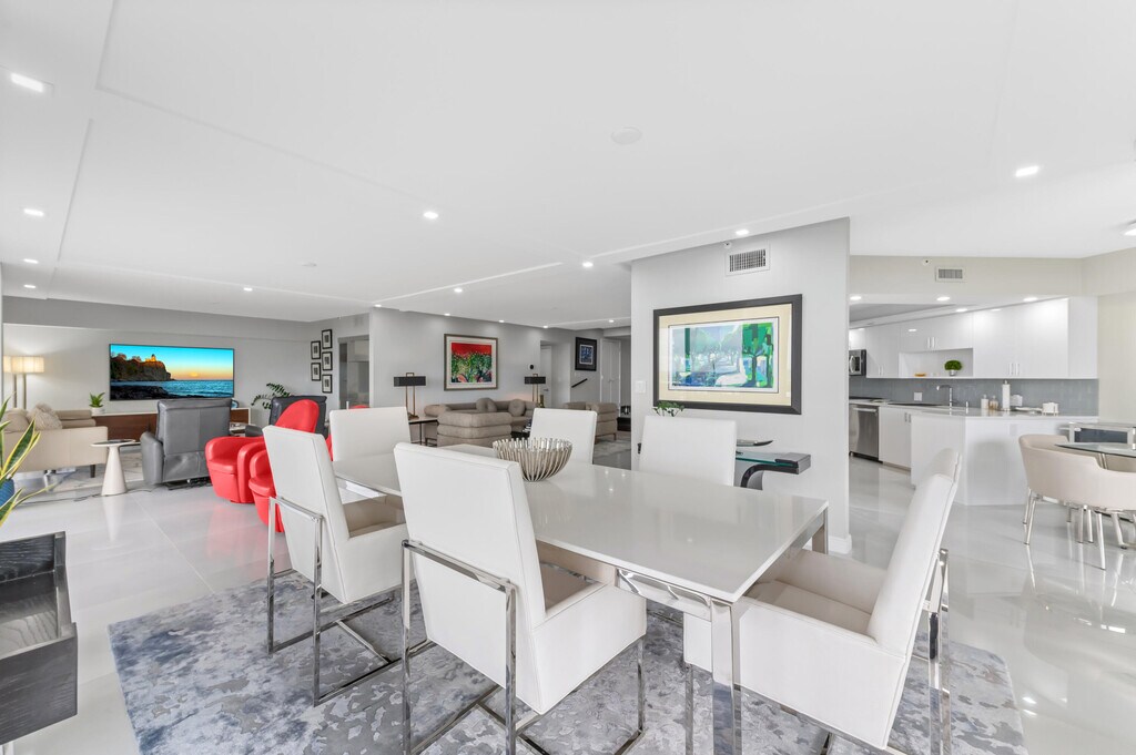 Courtesy of William Raveis Real Estate Posted by Andrew Coleman with EXP Realty . The epitome of elegance in the heart of WPB offering the grandeur of inside & outside living with a 640 sq. ft., wrap around terrace. Sublime and totally newly renovated, with intriguing contrasting colors . Dazzling white kitchen with stone countertops and brand new appliances. The large spaces with porcelain tiles throughout & marble tiles in foyer enhance the spaciousness of the areas. The 3rd BR is opened up to the LR and offers from the floor to ceiling windows/doors expansive mind blowing views on the ocean, lake, golf, and the cities of Palm Beach and West Palm Beach. This unique condo has it all, perfect walls and ceilings, gorgeous bathrooms and Your dreams come true with a huge walk-in closet.