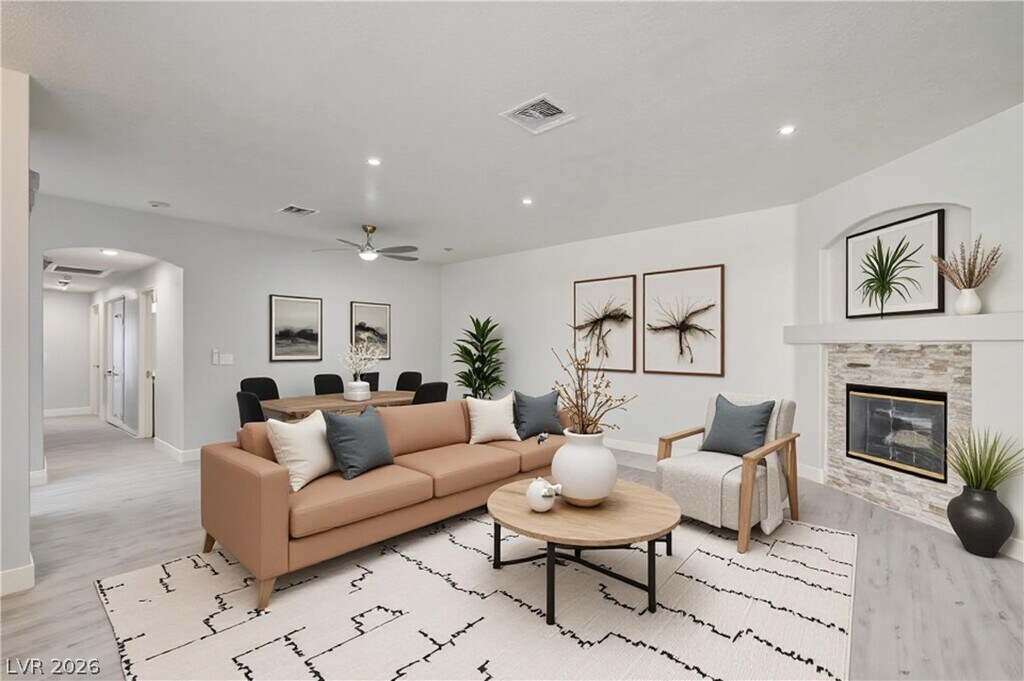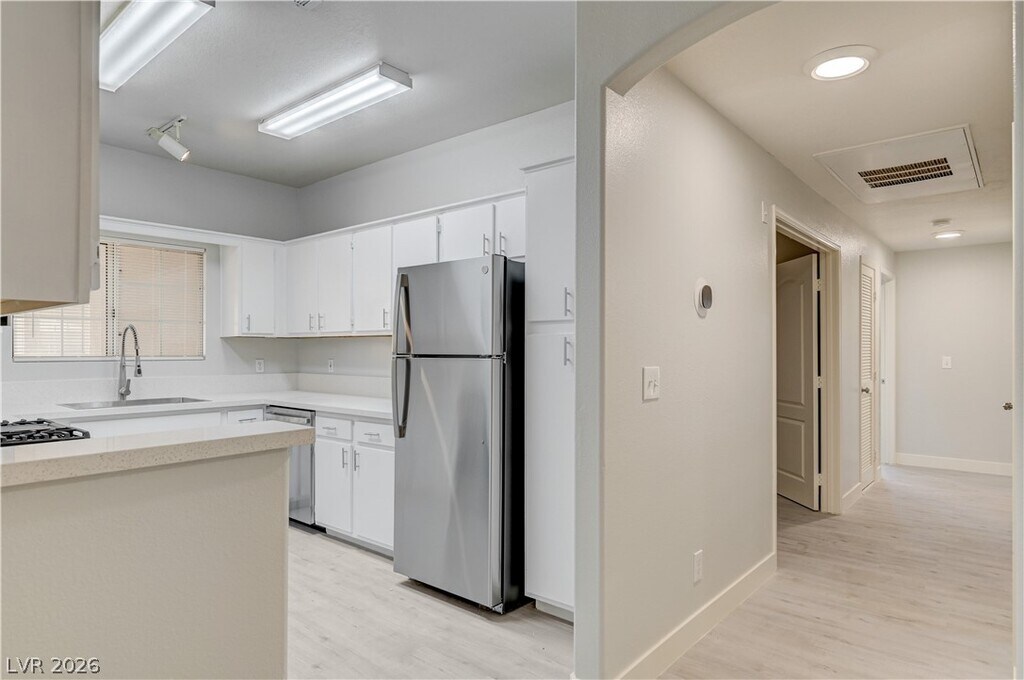 Beautiful second-floor condo located in a well-maintained gated community in Spring Valley, Las Vegas. This three-bedroom, two-bath home boasts a fresh, modern design and abundant natural sunlight. Enjoy the newly painted interior, brand-new luxury wood-look flooring, a fully updated kitchen equipped with elegant white cabinetry, sparkling granite countertops, stainless-steel appliances, and a brand-new washer and dryer. The bathrooms have been completely remodeled, including new sinks, faucets, toilets, and stylish walk-in showers. Relax and unwind on the spacious two private covered balconies, one at the entrance and one off the primary bedroom. The living room features a cozy fireplace, creating a warm and inviting atmosphere. The unit also includes a detached one-car garage. Community amenities include a sparkling pool, spa, park, BBQ area, and ample guest parking. Centrally located with convenient access to shopping, dining, entertainment, schools, hospitals, and major freeways.