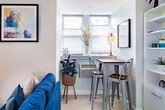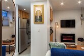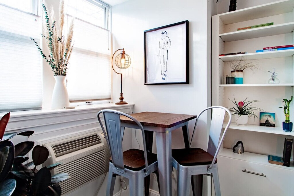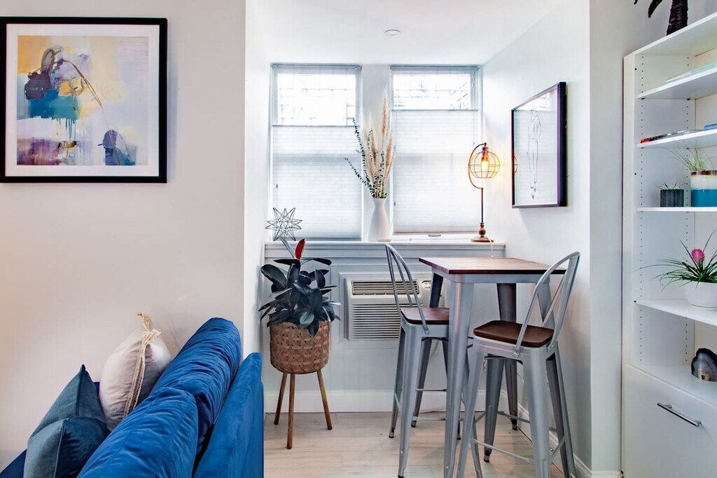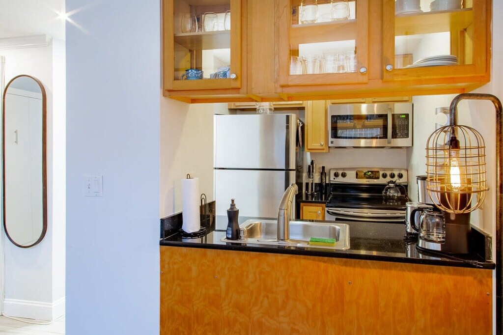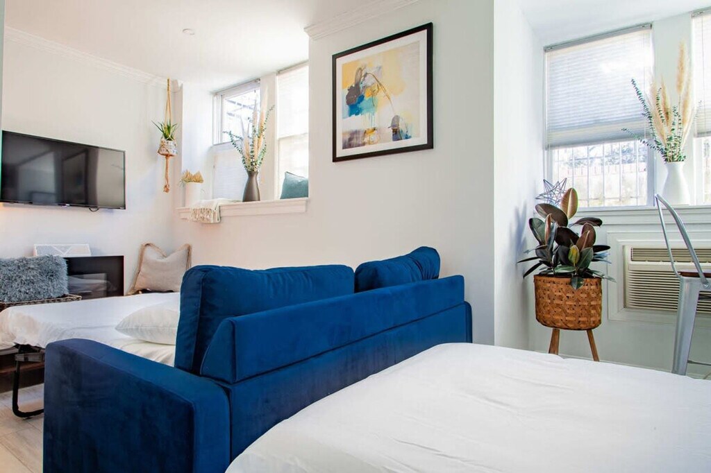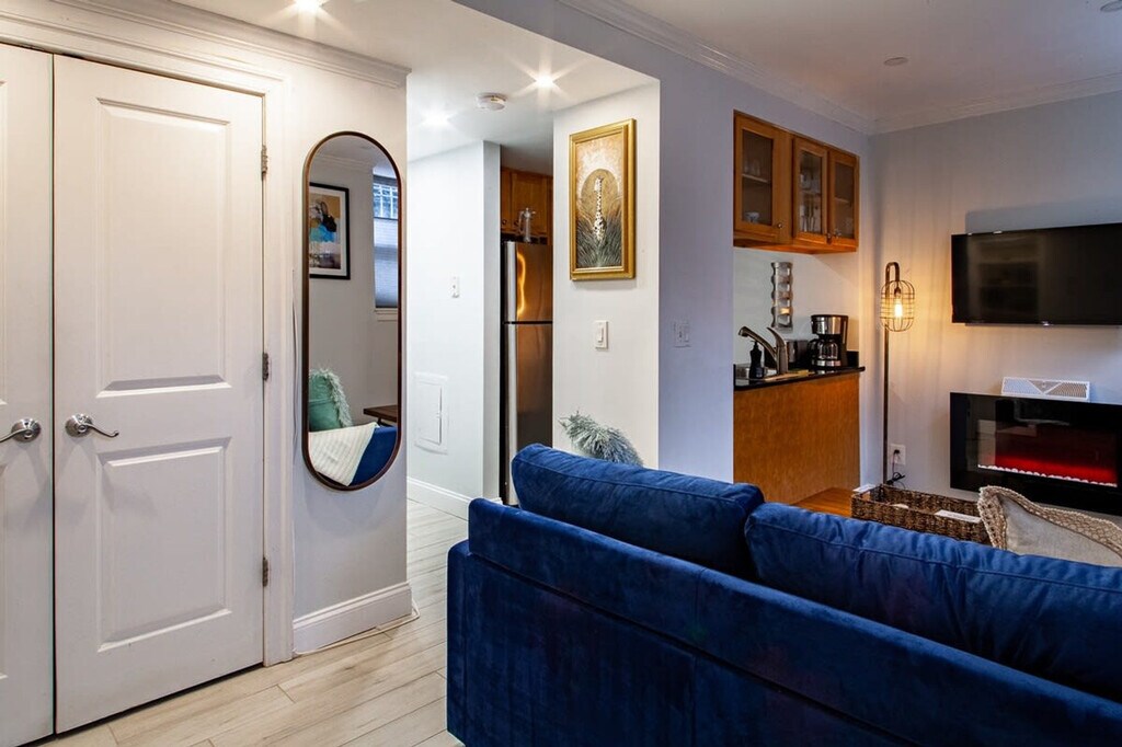 Feel at home in this inviting and well-equipped studio apartment in Washington DC, located just one block from the lively U Street Corridor. With a Walkscore of 97, this walker's paradise allows you to accomplish daily errands on foot. Enjoy the convenience of being a 10-12 minute walk from two Metro subway stations, U St/Cardozo and Dupont, and just two blocks from the bustling 14th Street filled with restaurants, shops, and a Trader Joe's grocery market. This designer studio apartment is perfect for both business and leisure visits to the capital city. Comfortably sleeping up to three people, it features a Murphy single bed and a full-size pullout sofa bed. The fully equipped kitchen includes a microwave, oven, dishwasher, coffee maker, toaster, stove-top kettle, and full-size refrigerator, making it easy to enjoy homemade meals during your stay. High-speed Wi-Fi is also provided for your convenience. Coin and card-operated washers and dryers are available directly across the hall from the apartment. U Street is a vibrant cultural hub, historically known for its homegrown music scene, including jazz and blues. Today, it boasts renovated clubs, new restaurants, and shops, making it the center of DC's nightlife. The area is rich in history, with landmarks like the 1922 Lincoln Theatre and dining options such as Ben's Chili Bowl and Little Ethiopia's eateries. Getting around is easy with nearby Metro stations, bus stops, and Capital Bikeshare, as well as Uber, Lyft, and scooter rentals readily available. The apartment features an electric fireplace with colored light options and a separate heating option to keep you warm during winter nights. Trash should be taken to the back of the building, with access through a door near the apartment. House rules are strictly enforced, with penalties of up to $500 for violations, including noise complaints, evidence of parties, or smoking odors. Quiet hours are from 10 PM to 8 AM, and only those on the reservation are permitted inside the apartment. The apartment offers free high-speed Wi-Fi, making it remote work-friendly. [SI]