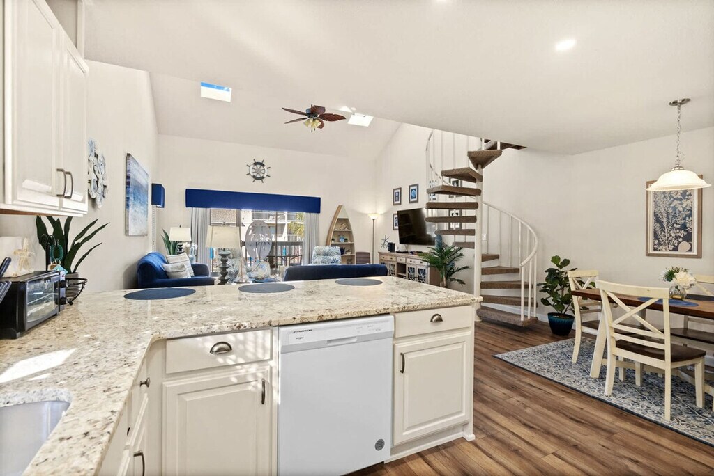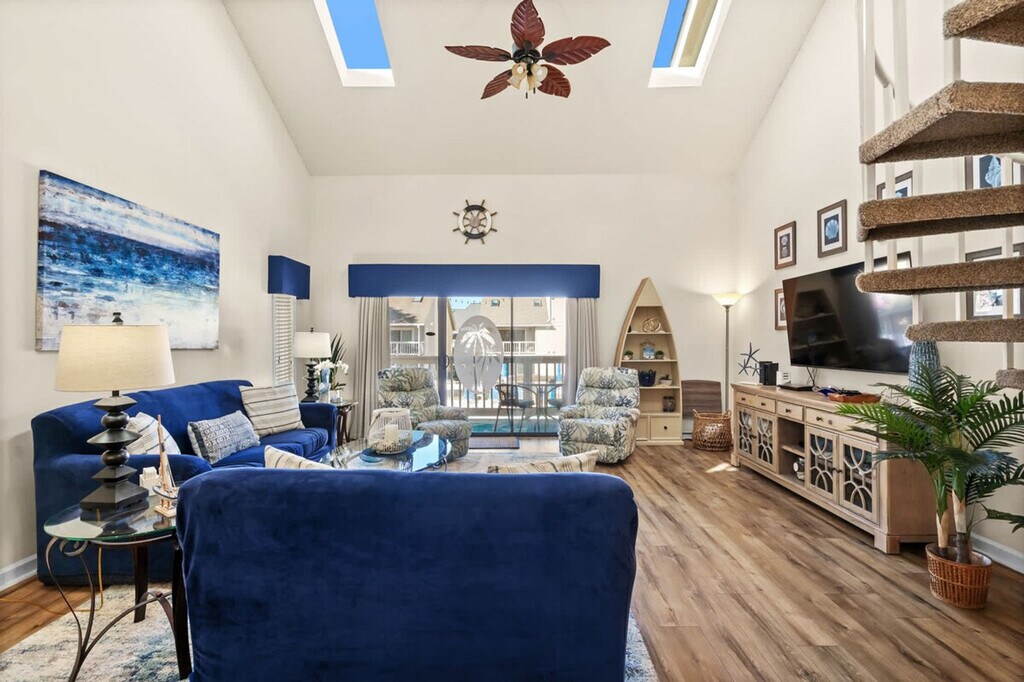 Feel at home in this recently remodeled and spacious 2nd-floor end unit condo. Located 1.3 miles from Surfside Beaches, this 2-bedroom, 2-bath condo offers a quiet and relaxing community atmosphere. This updated and well-maintained 1250 sqft loft-style condo features a fully equipped, eat-in kitchen that opens to a large living space with vaulted ceilings and skylights. There are two indoor dining spaces at the table and kitchen peninsula, as well as a super nice deck for enjoying breakfast and coffee. The deck overlooks the immaculate and never-crowded pool and grilling areas and includes a utility closet with a full-sized washer and dryer for easy access. Enjoy shared access to the pool with other guests and homeowners. Amazing beach chairs are available for rent at a reasonable price. Located in Surfside Beach's Golf Colony Resort, one of the best-kept secrets in Surfside, this apartment is just 1.3 miles from the Surfside Beaches. Routine pest control treatment may be scheduled during your stay, typically occurring on the 4th Thursday of the month. The technician, who is fully licensed and insured, will need access to your unit to perform the service and will knock before entering. A fine may be applied if entry is refused. [SI]