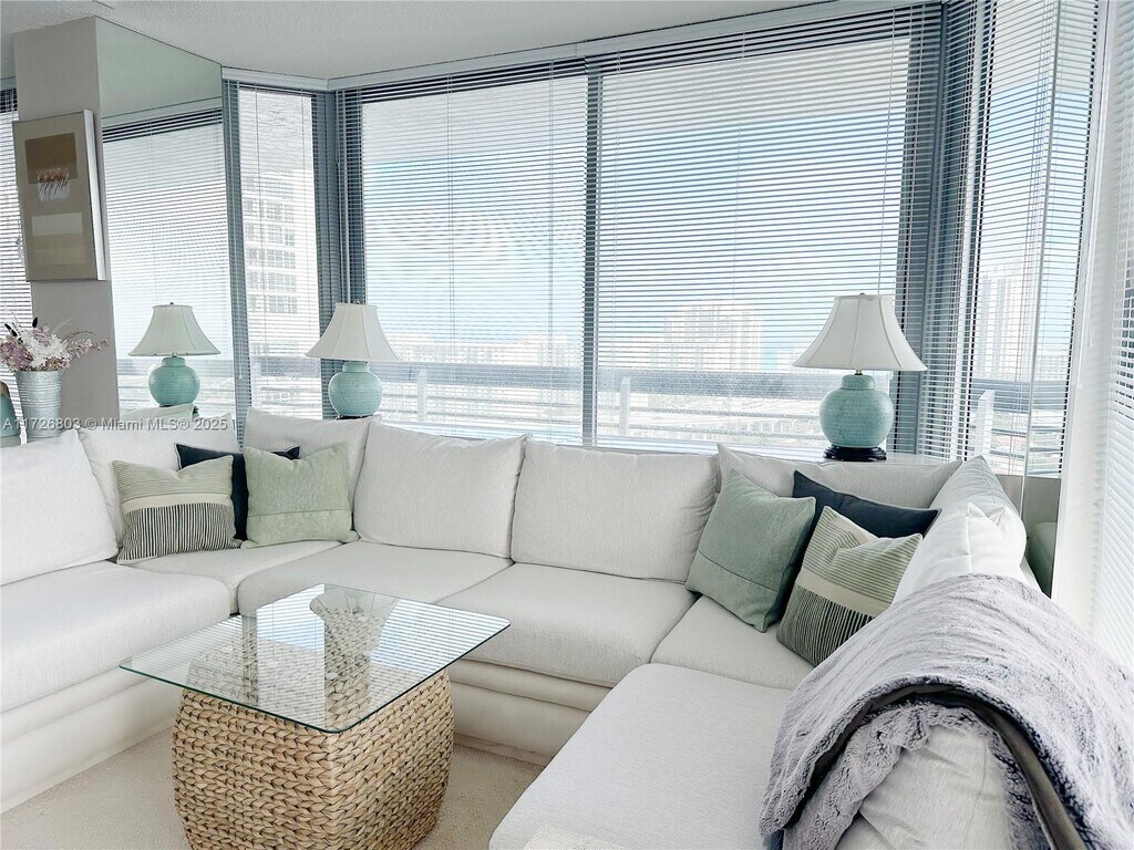 Large 2 bedroom/2 bath plus den, bay and lake/garden views, porcelain floor throughout, granite counter tops, built in office w/ murphy bed and lots of storage, full size washer and dryer, pool, jacuzzi tub, marina, restaurant, updated gym, basketball, tennis, pickleball, close to Aventura Mall, Gulfstream, and the Beach. Internet + Cable Included. All furniture can be removed as needed other than the built-in office with murphy bed. Available for 6 or 12 month rental.