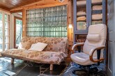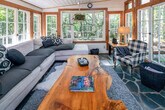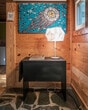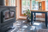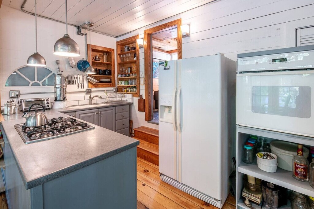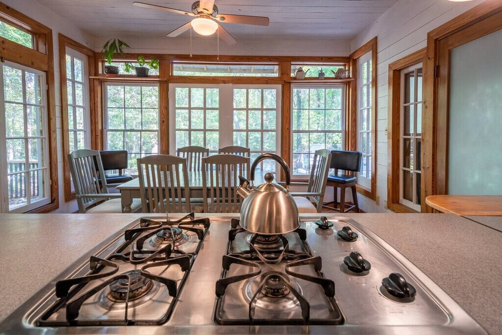 This quirky, multi-level ecological house is perfect for a getaway in the great outdoors. Nestled on 5 wooded acres, the home features covered terraces for al fresco dining, giant picture windows, and a wood-burning stove. Located just 15 minutes from Chapel Hill, UNC Memorial Hospital, Saxapahaw, and Pittsboro, you'll feel at home in this unique retreat. The house is a cozy and charming space with an abundance of windows and great art, creating a warm and inviting atmosphere. Handmade with artsy touches like original mosaics and wood and slate floors, the home includes a wood stove for cold days. The kitchen is fully stocked with pots, pans, spices, and cooking oils, and features a gas range, oven, microwave, and toaster oven. Enjoy organic coffee, a selection of teas, and a variety of kitchen appliances for your convenience. Well-behaved pets are welcome with a $50 fee per pet per stay. Unauthorized pets will incur a $200 charge. Attractions nearby include Franklin Street (9.6 mi), Kenan Stadium (10.4 mi), and The Barn at Valhalla (7.5 mi). For dining, Saxapahaw General Store Cafe is 11.7 mi away, and The Mod in Pittsboro is 12.8 mi away. Grocery stores like Lowes Food's and Harris Teeter are within 10 miles, and hospitals such as UNC Hillsborough Campus and UNC Children's Hospital are also nearby. The Raleigh-Durham International Airport is 28.7 mi away. The home has a very outdoorsy feel, with the possibility of encountering squirrels, birds, and other wildlife. Summertime may bring bugs inside, and cobwebs can appear overnight. The property uses natural pest management strategies and is chemical and fragrance-free. The house has multiple levels and stairs, making it unsuitable for those seeking a single-level space. The only bathroom is upstairs. Unauthorized pets will incur a $200 charge. The owners built the home by hand using recycled and repurposed materials, creating a rustic and eclectic eco-retreat that stands in collaboration with nature. Enjoy the mosaics made from recycled tiles and the re-homed picture windows and stained glass, all crafted with love and appreciation for the materials used. [SI]