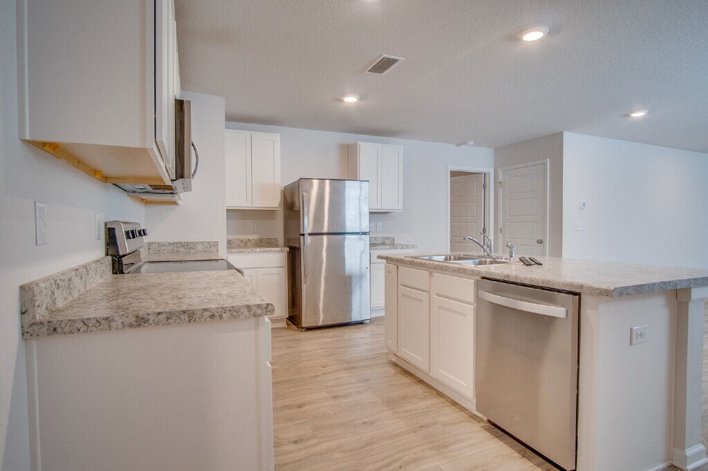 Newer construction 3/2 home in the Ashland Manor subdivision in North Pensacola off 9 Mile Rd. This home features an open-concept layout with wood-look flooring throughout the main living areas and a kitchen equipped with all stainless steel kitchen appliances, plenty of cabinets, and a large island with bar seating. The carpeted primary bedroom includes a private ensuite bathroom with a double sink vanity, walk-in shower, and walk-in closet. Two additional carpeted bedrooms share a full bathroom with a tub/shower combo. A covered back porch overlooks the unfenced backyard. Pets are accepted upon owner approval with a $250 non-refundable pet fee per pet. Residents are required to have renter liability insurance, which can be added for $11.95/month, or you can opt into the Resident Benefits Package (RBP) for $45/month, which includes renter liability insurance, HVAC air filter delivery, and on-demand pest control. Ready for move in!