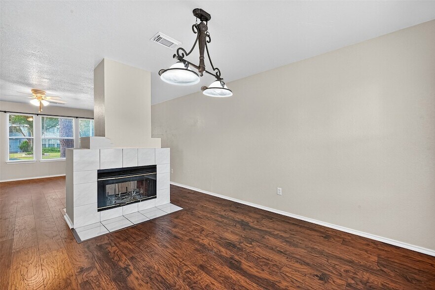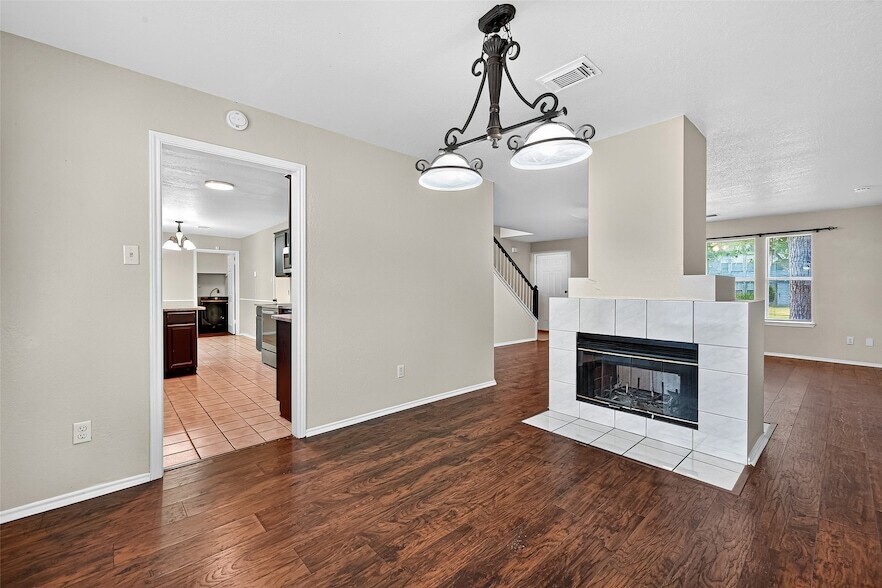 Charming 3-bedroom, 2.5-bath home, located in the Estates of Highland Creek community, offers plenty of space and an open layout perfect for gatherings and everyday living. A dramatic double-sided fireplace connects the living and dining rooms, serving as a striking centerpiece for the home. The large kitchen features a breakfast bar, bright breakfast nook, and abundant cabinet space, ideal for cooking and hosting. Laminate wood flooring and tile extend throughout, providing a clean, polished look. Upstairs, the expansive primary bedroom is filled with natural light and includes a bath with dual sinks, a whirlpool tub, full-entry shower, and a large full-entry closet. Two additional bedrooms and a spacious gameroom offer versatility for work, hobbies, or relaxation. The backyard has a covered deck and no back neighbors perfect for outdoor gatherings or quiet evenings. This home offers an exceptional layout and a sought-after location in a welcoming community.
