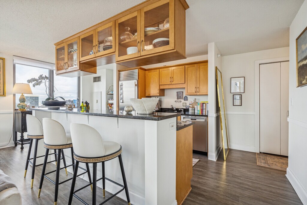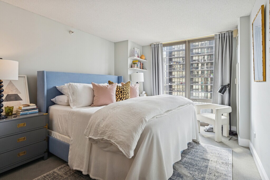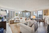 FULLY FURNISHED CONDO AVAILABLE 10/1/25-4/30/26. Highly Sought-After High-Floor Corner One-Bedroom with Balcony! This spacious and bright residence features floor-to-ceiling windows in the large living room, offering sweeping views and abundant natural light. The open-concept white kitchen includes Whirlpool appliances and a granite breakfast bar, perfect for entertaining. Enjoy the convenience of in-unit laundry and a generous walk-in closet in the bedroom. Heat, A/C, and basic cable included! Full-amenity building with 24-hour door staff, penthouse sundeck, fitness center, on-site dry cleaners, and bike storage.