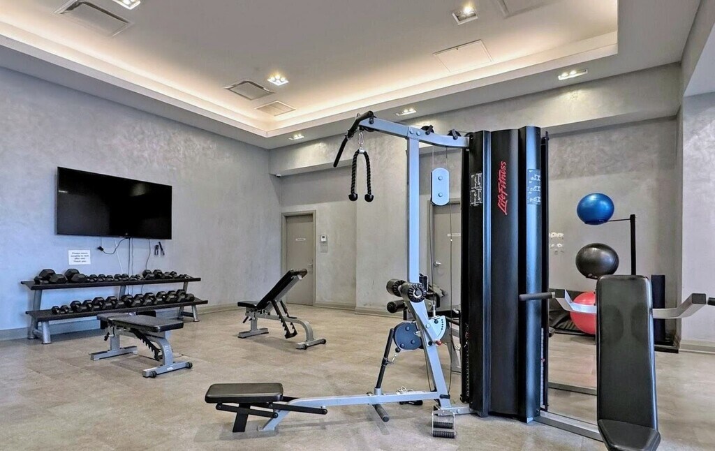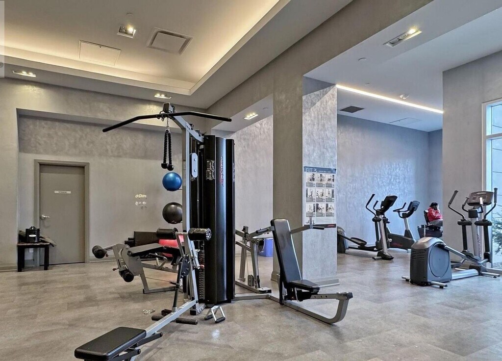 This 1-bedroom, 1-bathroom apartment at 20 Meadowglen Pl offers 584 square feet of living space. The unit features a den, ideal for a home office or additional storage. The kitchen is equipped with stainless steel appliances and quartz countertops, providing a modern cooking environment. The living room benefits from floor-to-ceiling windows, allowing for ample natural light. The bathroom includes standard fixtures and is conveniently located near the bedroom. Building amenities include an elevator, air conditioning, a fitness center, and a pool. Additional features include in-unit washer/dryer, storage space, a balcony, and concierge services.