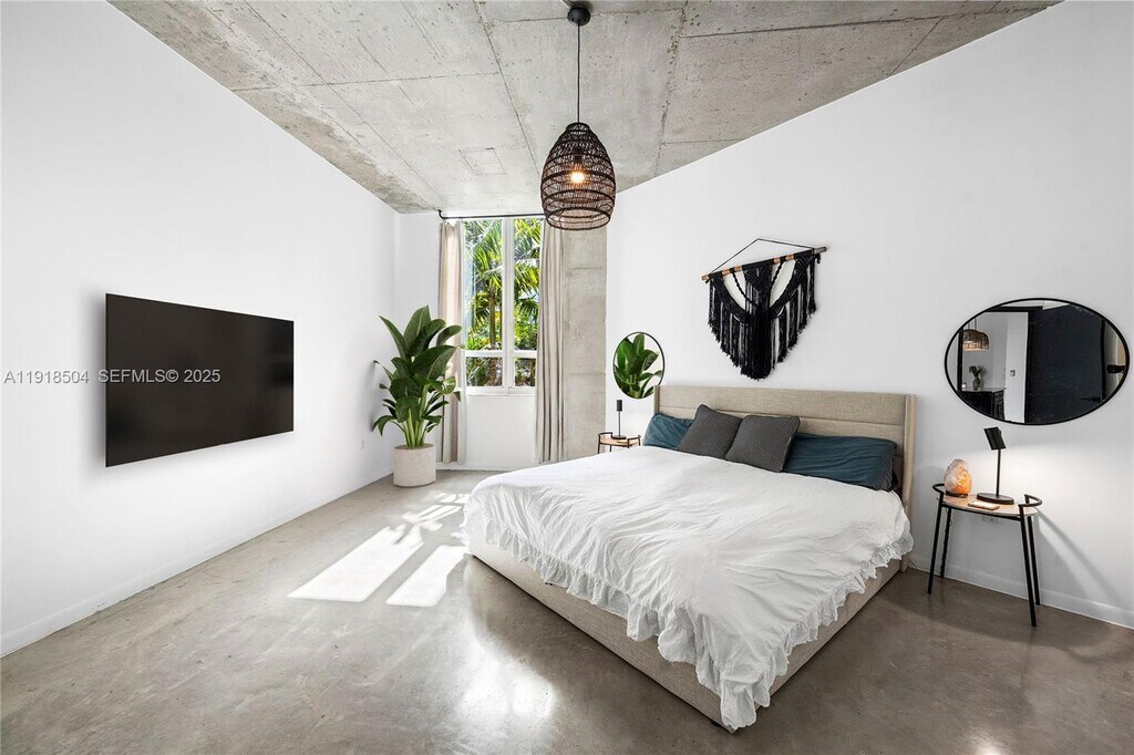 Edgewater industrial-chic living at its finest. Soaring 11' ceilings and oversized tile floors create a loft-like ambiance in an open-concept layout where kitchen, dining, and living spaces flow seamlessly. Concrete bedroom floors add urban edge, while both bathrooms feature tubs and the master boasts a double-sink vanity plus exceptional walk-in closet space. In-unit laundry with washer/dryer included. Fully furnished with trendy, New York-inspired pieces ready for immediate move-in. Positioned directly across from Margaret Pace Park, the boutique building delivers full-service living: 24/7 front desk, valet, security, beach-style pool, Jacuzzi, TechnoGym, and club room. Unbeatable access to Wynwood, Design District, Midtown, Downtown, major highways, beaches, and airport.