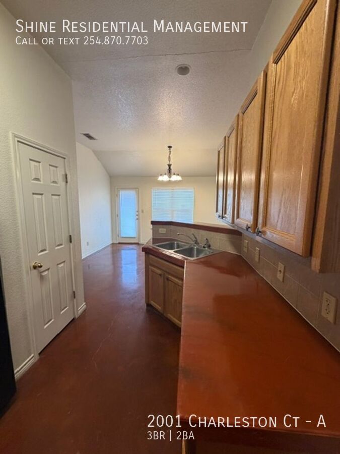 Discover this 3-bedroom, 2-bath home in Killeen, TX, featuring stained concrete floors and stained kitchen countertops that blend durability with low-maintenance style. The spacious master suite includes a dual vanity and garden tub, plus a walk-in closet for organized storage. Each room has ceiling fans and white faux wood window blinds; the home is equipped with central air and heat for year-round comfort, and a washer/dryer for convenience. The kitchen offers black appliances, including a black glass flat-top oven and garbage disposal. Outside, enjoy a large, wood privacy-fenced backyard and a 1-car garage with opener. 1 Car Garage Parking With Opener Black Appliances Black Glass Flat Top Oven Central Air And Heat Dual Vanity In Master Bath Garden Tub In Master Bath Large Back Yard Stained Concrete Floors Stained Kitchen Counter Tops Walk In Closets Washer/Dryer White Faux Wood Window Blinds Wood Privacy Fenced Yard