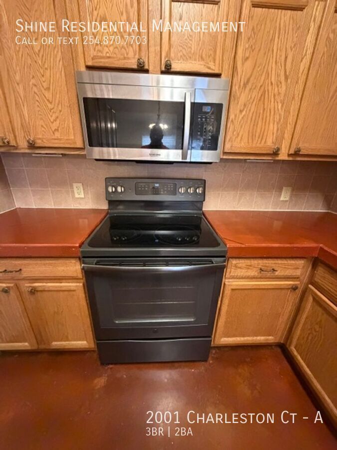 Discover a well-appointed apartment in Killeen, TX featuring stained concrete floors and stained kitchen countertops that offer a modern, low-maintenance aesthetic. The layout includes walk-in closets and dual master bathroom sinks, plus a garden tub in the master bath for added comfort. A full-size washer and dryer are included, and white faux wood window blinds provide a clean, coordinated look. Ceiling fans help circulate air throughout the home. Outside, a large yard is enclosed by a wood privacy fence, and a 1-car garage with opener offers secure parking. The kitchen is equipped with black appliances, including a black glass flat-top oven. 1 Car Garage Parking With Opener Black Appliances Black Glass Flat Top Oven Dual Master Bathroom Sinks Garden Tub In Master Bath Large Yard Stained Concrete Floors Stained Kitchen Counter Tops Walk In Closets Washer/Dryer White Faux Wood Window Blinds Wood Privacy Fence