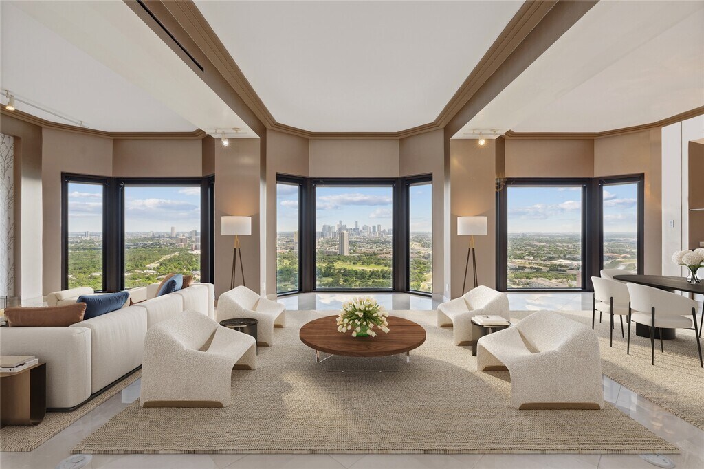 Two story penthouse on floors 39 and 40 overlooking Hermann Park with expansive views of the Houston skyline. High ceilings,open floor plan and generous room sizes. Island kitchen with breakfast room and walk-in wine storage. Formal dining room with glass display shelves,granite top serving areas with shelved cabinetry below offering great storage. Large living room with cozy library alcove with built-in shelving. Marble floors at living areas on floor 40,hardwoods at bedrooms on floor 39. Electric solar shades,designer and art lighting. Expansive primary suite with sitting room,walk-in closet,private balcony and luxurious bathroom. Walk-in laundry with full size stacked W/D. Park-side full service high rise living with 24 hour guarded entry,concierge,valet,porter,fitness center with dry sauna,party rooms and indoor racquetball court. Private resident access to hike/bike trails connecting you to Hermann Park and the medical center. Convenient access to freeways and Downtown. MLS# 60627149