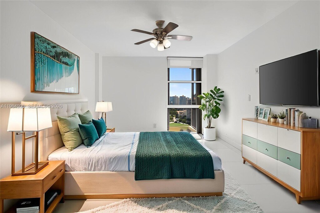 Amazing 2 Bedroom and 2 Bathrooms condo with a panoramic view of the Golf Course, Ocean and Lakes, located along Country Club Drive in the heart of Aventura. This rare to find corner unit is remodeled and features stunning views from every bedroom and living room. Two ensuite bathrooms. Remodeled kitchen with granite counter tops. One cover parking and plenty of guess parking. Brand new impact windows. Porcelain tile floors throughout. Spacious and full of natural light. Plenty of closet space and walk-in closet in the primary bedroom. Rent includes water, internet and cable. Full amenities community with fitness center, sauna, heated pool, jacuzzi, Security 24/7. MLS # A11964900