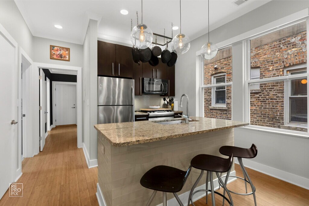Located in the heart of Bucktown, this 2 bedroom 1 bathroom apartment just steps from Milwaukee Avenue's vibrant shops and dining, this stylish condo offers the perfect blend of comfort and convenience. Tucked inside a quiet, well-maintained building, the home features in-unit laundry, central air with a Nest thermostat, and a private back porch ideal for relaxing or entertaining. The kitchen boasts granite countertops, a clean white tile backsplash, dark modern cabinetry, and a full suite of stainless steel appliances, including a dishwasher, garbage disposal, and reverse osmosis (RO) water filtration system. The bathroom is a design standout with gray brick-look tile walls and a dual showerhead setup offering both handheld and traditional nozzles. Enjoy a refined urban lifestyle in one of Chicago's most sought-after neighborhoods