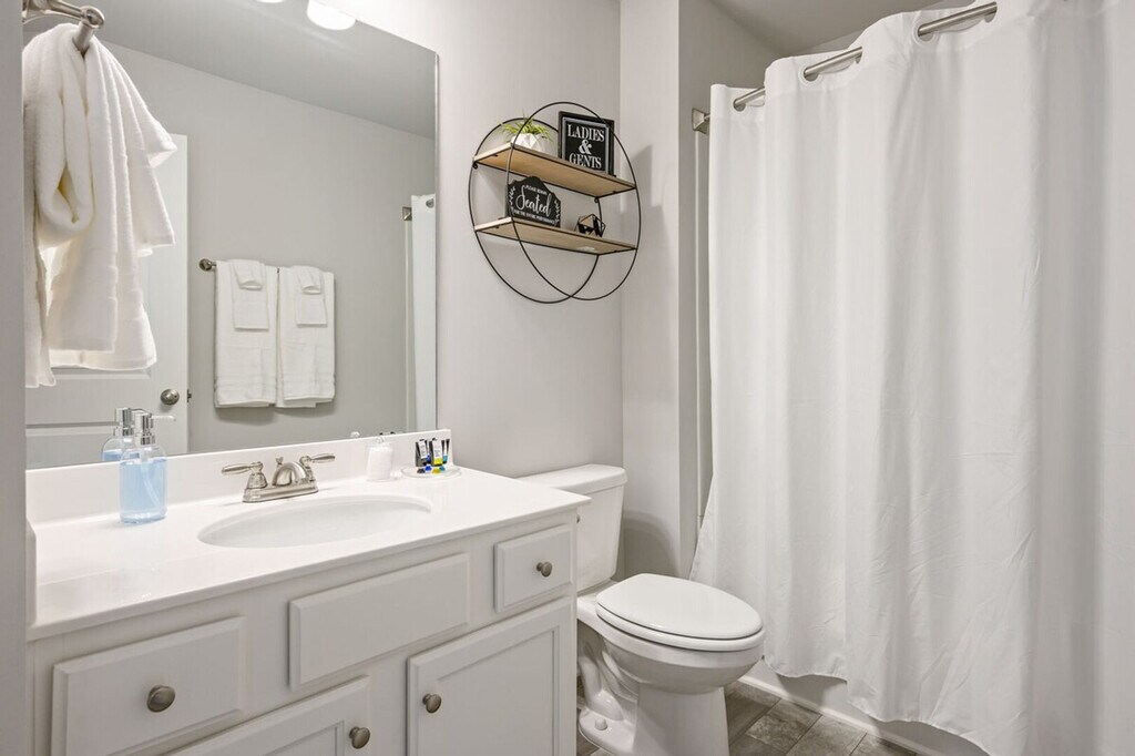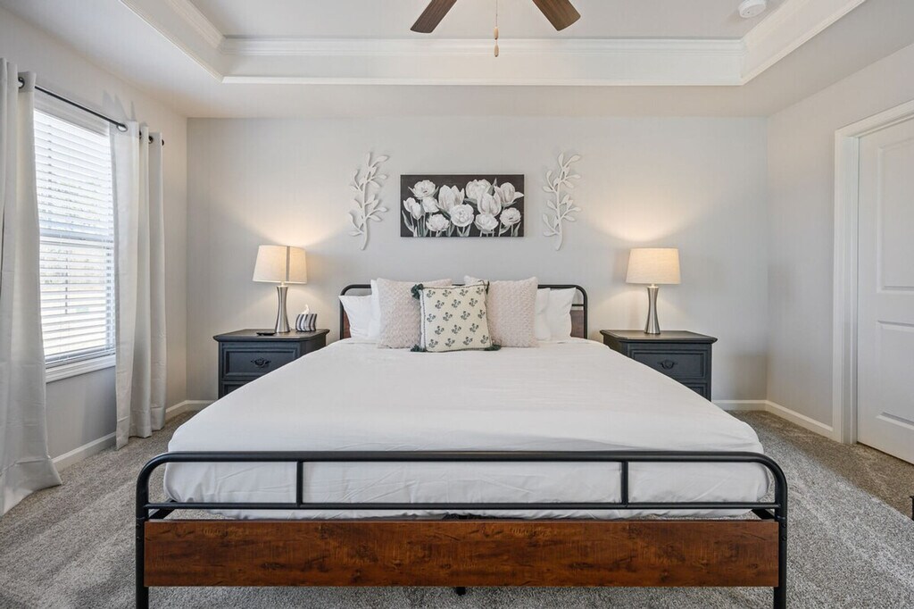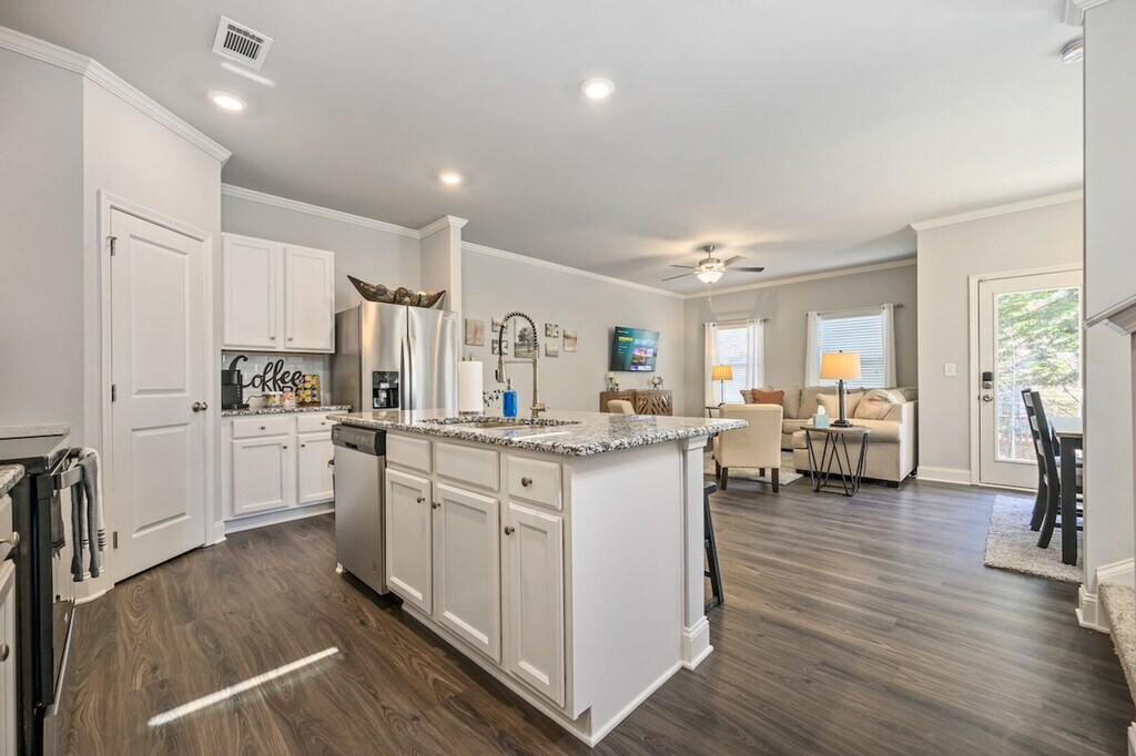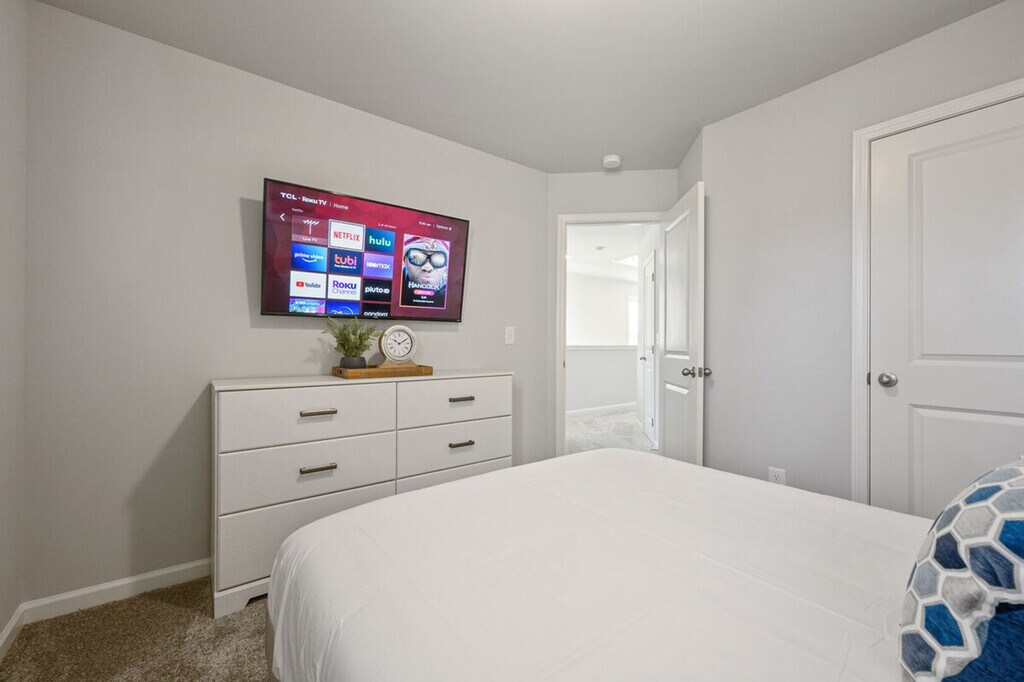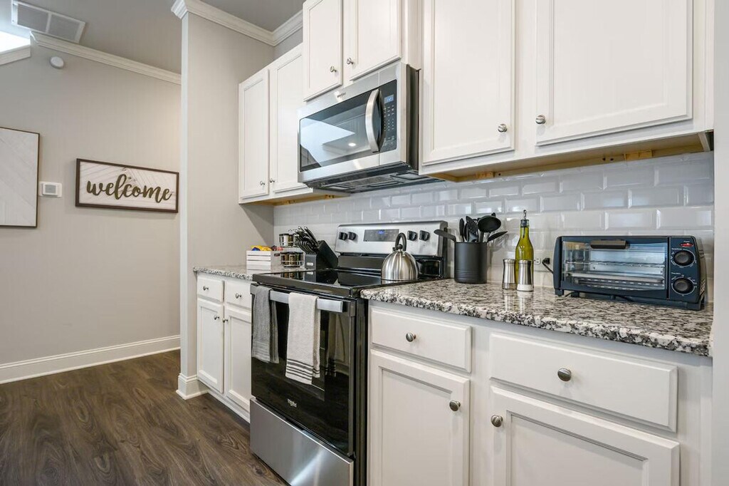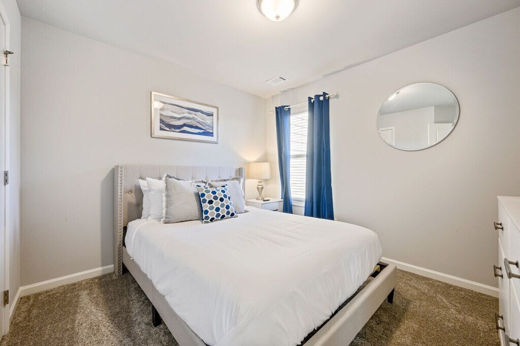 Feel at home in this newly constructed, fully furnished 3-bedroom, 2.5-bath home, thoughtfully designed for both short-term and long-term stays. The open-concept main floor features a living room, dining area, and kitchen island. The kitchen features brand-new stainless steel appliances and stocked cookware. Upstairs, the master bedroom includes a king-size bed, private en-suite, and smart TV. Guest rooms include one queen bed and one full-size bed with a shared hallway bath. Smart TVs are in every bedroom. Fresh bed and bath linens plus blackout curtains are provided for restful nights. High-speed Wi-Fi is available throughout the home, and a welcome tray with snacks and Keurig K-Cups is provided. This apartment is family and pet-friendly with pet fees that apply. The pet fee is $25 per pet, per night for stays of 1-6 nights, $15 per pet, per night for stays of 7-28 nights, and $10 per pet, per night for stays of 29+ nights. A mid-stay clean is required for stays of 40–60 nights, during which linens and toiletries are replenished. For stays over 60 nights, a deep clean replaces the standard checkout clean. Conveniently located off I-85, this apartment is within walking distance of local dining options and near the Chattahoochee River National Recreation Area and the Southeastern Railway Museum. This is a non-smoking property, and events are not permitted. Pets are considered and require approval before check-in. [SI]
