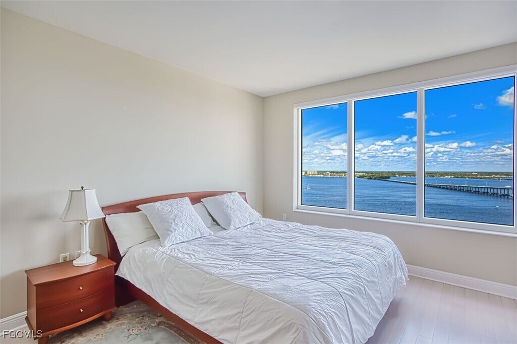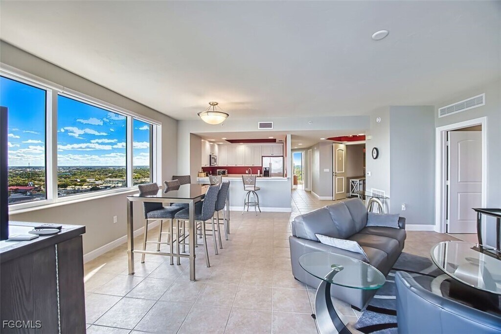 River View Urban Perfection on the 18th floor. Move-in ready,with 2135 sq ft indoor/outdoor living space. From the moment the secured elevators open into your private foyer,the double entry doors take you into a split open plan,2 BR + Den and 2 BA condo with 2 balconies: one overlooking the river and one the city. Features that stand out: corner unit with windows galore,hurricane shutters,Hunter Douglas electric window treatments,new a/c 2026,new water heater 2025,2 guest suites for overflow family and guests,furniture for sale. Primary Suite opens up to the screened riverfront balcony & bath has his and hers vanities,huge shower,separate tub and 2 closets. Additional bedroom & den open up to a sunny city view balcony. Nothing is left to do here but LIVE in a Premier Luxury High Rise with a social & fitness calendar as busy as you want,heated pool,hot tub,his/her saunas,BBQ grills,fitness center and gathering rooms,2 garage parking spaces one assigned and one visitor. ENJOY the conveniences of downtown Fort Myers walking distance to dining & entertainment. . WELCOME HOME
