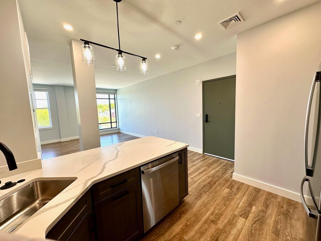 Flexible lease start date. Unit 403 is a TOP floor,rear facing,corner 2 BED 2 BATH unit. Kitchen has soft-closing cabinets (w/ under lighting),QUARTZ counters,STAINLESS STEEL appliances,breakfast bar & an open floor plan w/ high ceilings,LVP flooring,recessed lighting & big windows. IN-UNIT WASHER & DRYER. Central air for heat & COOLING. Primary bed w/ walk-in closet and a private bathroom. The building has an elevator & GARAGE PARKING FOR ONLY 1 is underground (no option for 2nd car at the building). PET FRIENDLY BUILDING. The street level is commercial space. There are 3 upper levels of apartments. Rent INCLUDES water,sewer,hot water,trash & recycling (tenant to pay only electricity). Snow/ice melt away w/ RADIANT HEATED walk way & driveway. Relax on the ROOF DECK w/ furniture & grill provided by the owner. Great location close to other shops,restaurants,MBTA service,the Common,weekend farmers market & more. Mix of occupied & vacant photos. MLS# 73479936