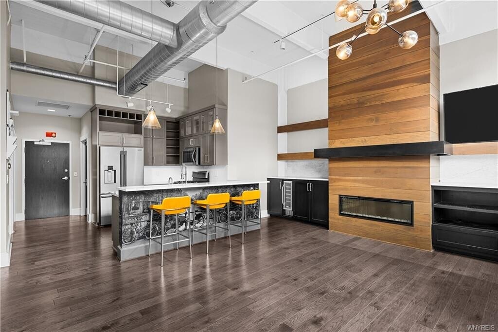 Live at the center of it all in this stylish and spacious 2-bedroom, 2-bathroom condo, offering a well-designed layout that blends comfort and functionality. Step inside to discover a bright and inviting unit filled with natural light streaming through large windows, highlighted by soaring ceilings. The updated kitchen features stainless steel appliances, custom cabinetry, granite countertops, and a breakfast bar that seamlessly connects to the open living area. A cozy fireplace anchors the space, making it ideal for relaxed evenings or lively gatherings with friends. Convenience meets comfort right at the entry, where you'll find an in-unit washer and dryer along with a full guest bathroom. Toward the back of the unit are two spacious bedrooms, including a serene primary suite complete with its own private full bath—offering a perfect retreat. Additional features include secure front entry, a generously sized private storage unit in the basement, and two dedicated parking spots in a gated lot. Just steps away from Buffalo’s best restaurants, entertainment, and waterfront attractions, don’t miss your chance to own a piece of the city’s energy and charm in this stunning condo. Some photos are virtually staged.